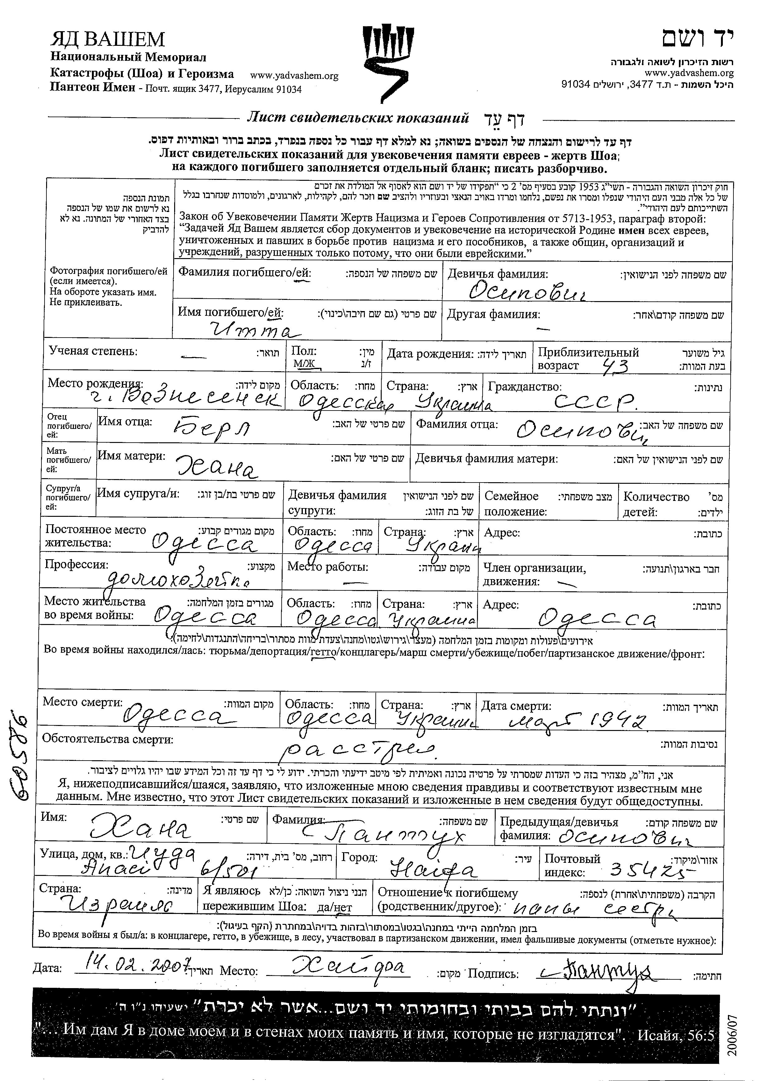 Itta שם משפחה לא ידוע לבית אוסיפוביץ נולדה בVoznesensk שבאוקראינה (ברה"מ) לBerl וחנה. היא היתה עקרת בית. לפני מלחמת העולם השניה התגוררה בOdessa שבאוקראינה (ברה"מ). בזמן המלחמה היא היתה בOdessa שבאוקראינה (ברה"מ).