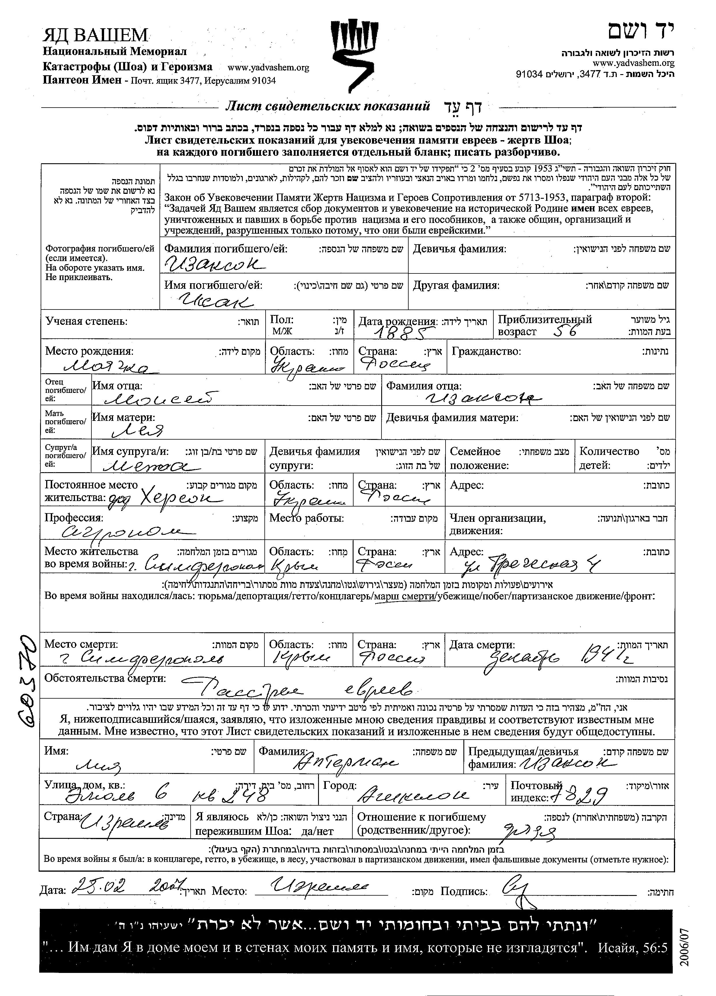איסק נרצח בשואה. מקום המוות: Simferopol שברוסיה (ברה"מ) בשנת 12/1941.