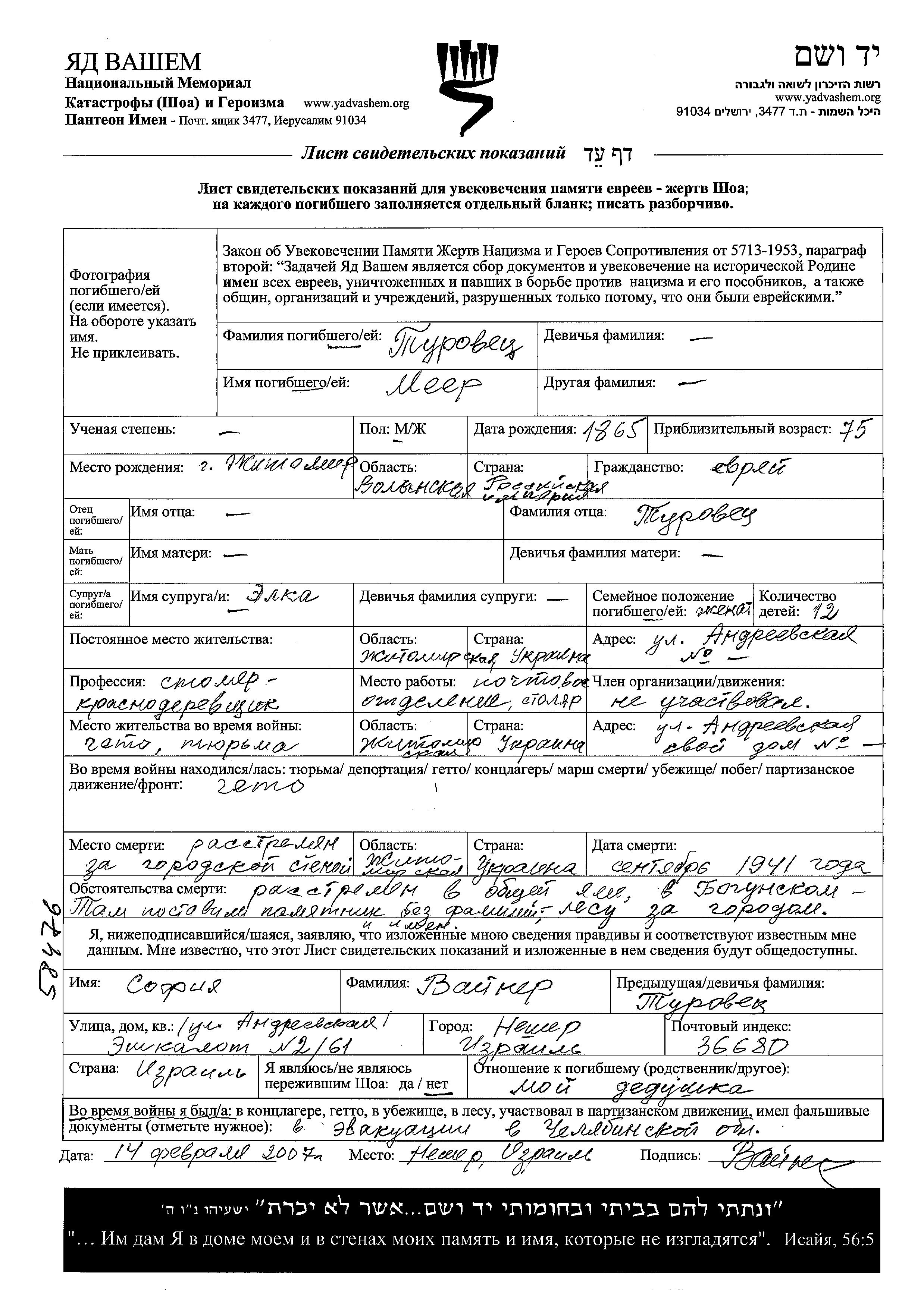 Meyer טורובץ נולד בZhitomir שבאוקראינה (ברה"מ) בשנת 1865. הוא היה נגר רהיטים ונשוי לאלקה. לפני מלחמת העולם השניה התגורר בZhitomir שבאוקראינה (ברה"מ). בזמן המלחמה הוא היה בZhitomir שבאוקראינה (ברה"מ). הוא נרצח בשואה. מקום המוות: Zhitomir Boguniya שבאוקראינה (ברה"מ) בשנת 09/1941.