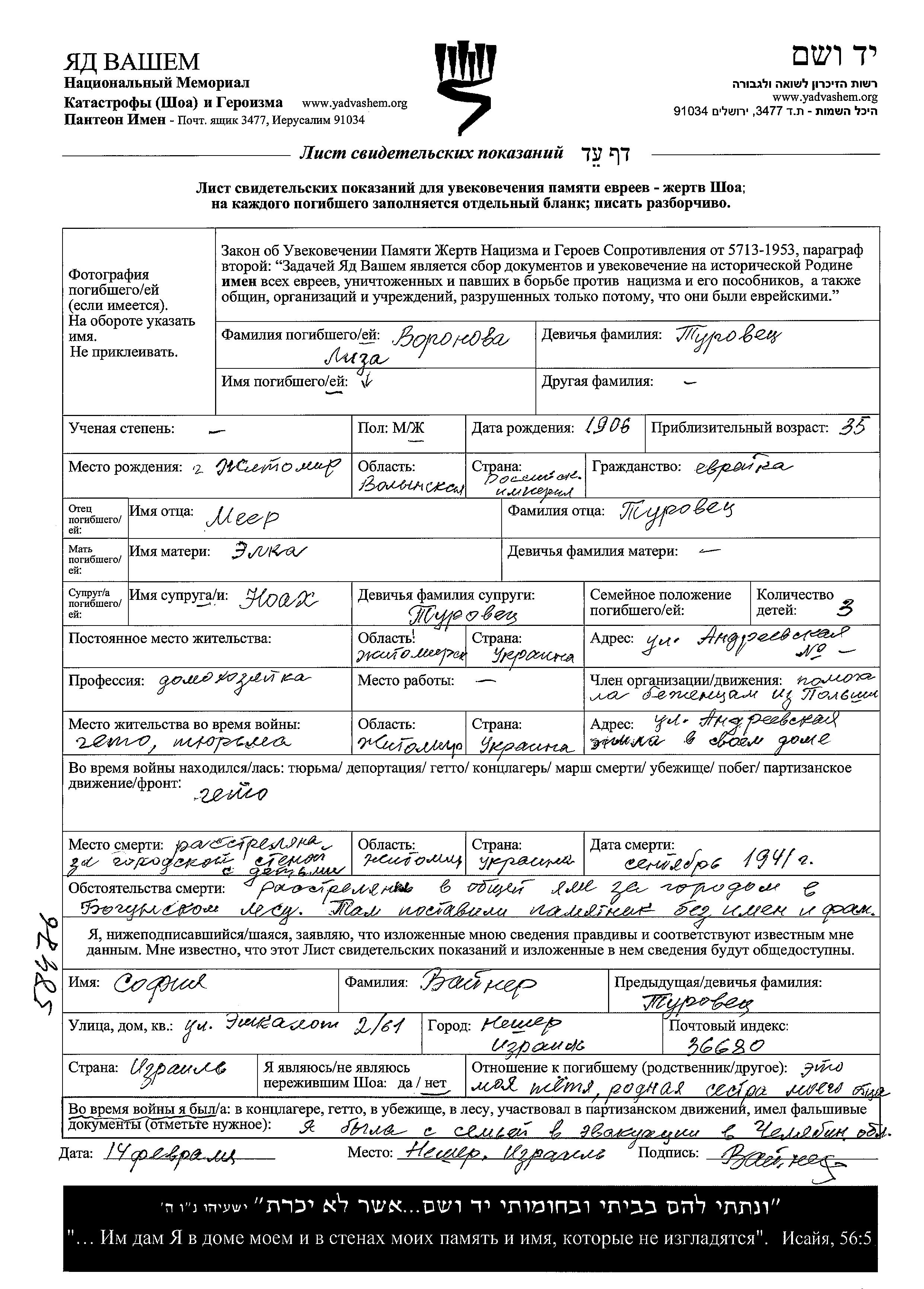 ליזה Voronova לבית טורובץ נולדה בZhitomir שבאוקראינה (ברה"מ) בשנת 1906 לMeyer ואלקה. היא היתה עקרת בית ונשואה לנח. לפני מלחמת העולם השניה התגוררה בZhitomir שבאוקראינה (ברה"מ). בזמן המלחמה היא היתה בZhitomir שבאוקראינה (ברה"מ). ליזה נרצחה בשואה. מקום המוות: Zhitomir Boguniya שבאוקראינה (ברה"מ) בשנת 09/1941.