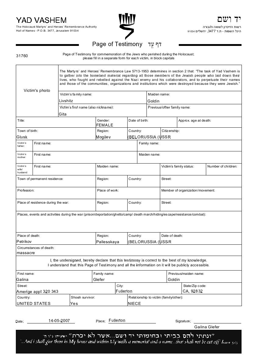 גיטה נרצחה בשואה. מקום המוות: Petrikov שבביאלורוסיה (ברה"מ).