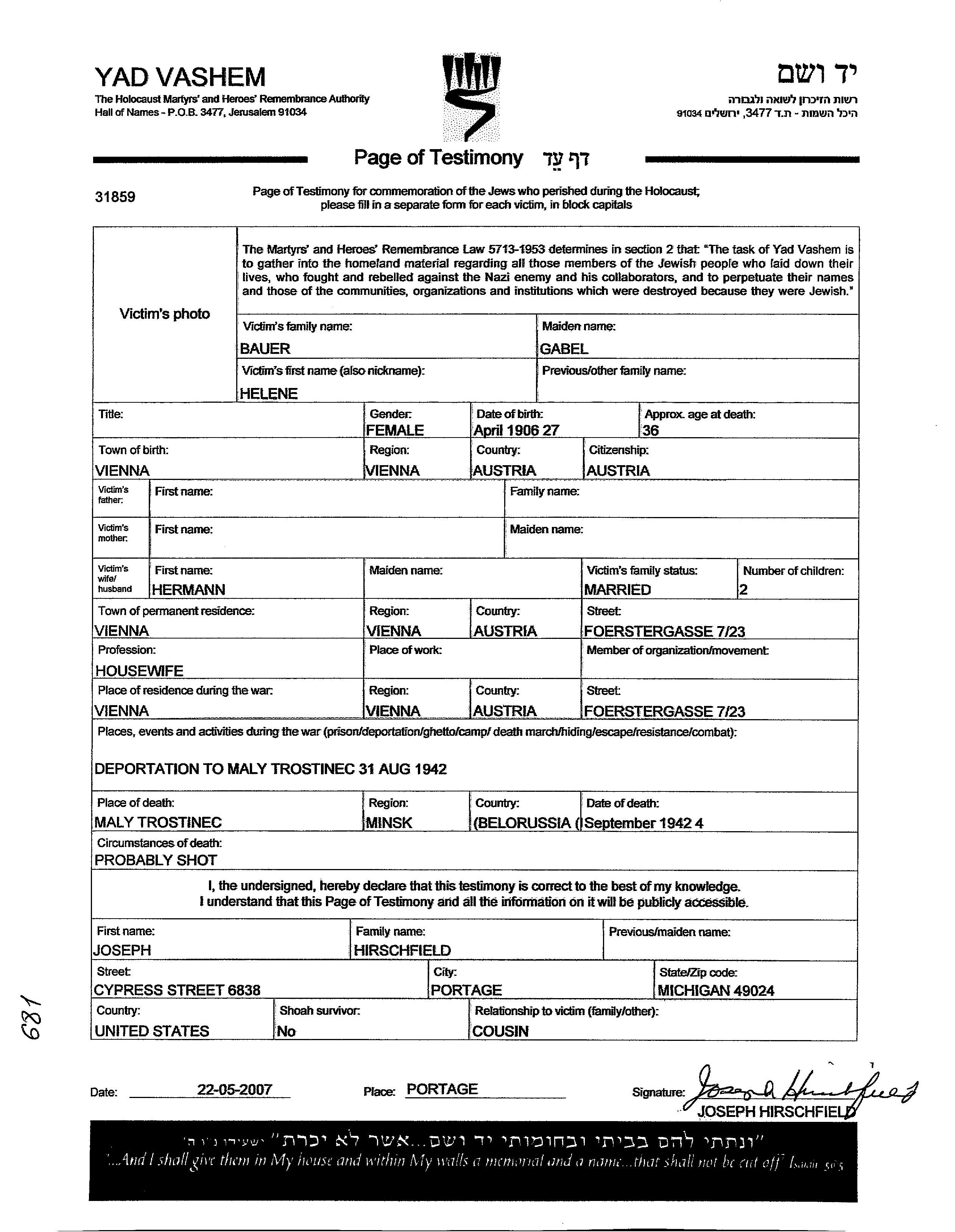 Helene באואר לבית גבל נולדה בVienna שבאוסטריה בשנת 1906. היא היתה עקרת בית ונשואה לHermann. לפני מלחמת העולם השניה התגוררה בVienna שבאוסטריה. בזמן המלחמה היא היתה בVienna שבאוסטריה. היא נרצחה בשואה. מקום המוות: Maly Trostinec שבביאלורוסיה (ברה"מ) בשנת 04/09/1942.