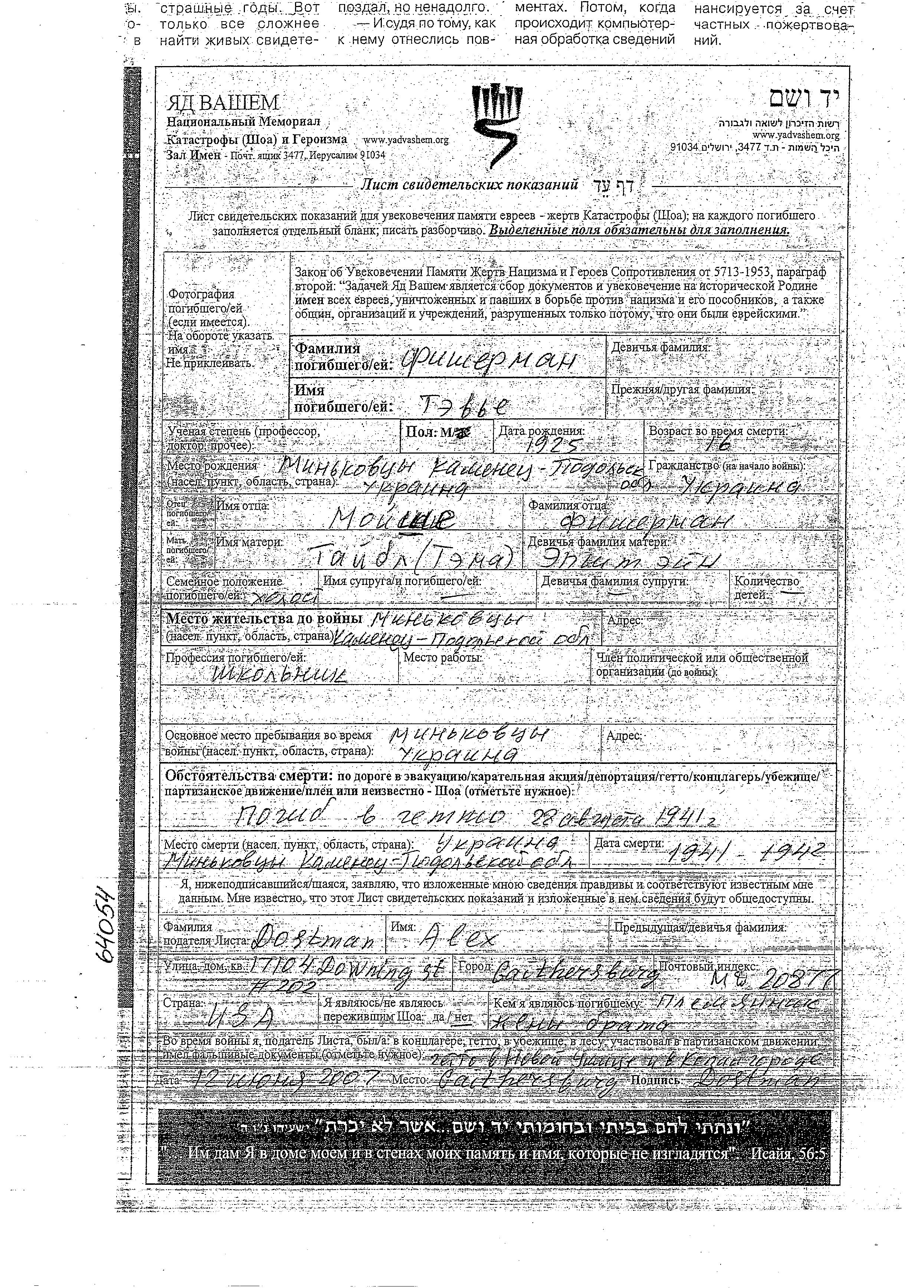 הוא נרצח בשואה. מקום המוות: Minkovtsy שבאוקראינה (ברה"מ) בשנת 28/08/1941.