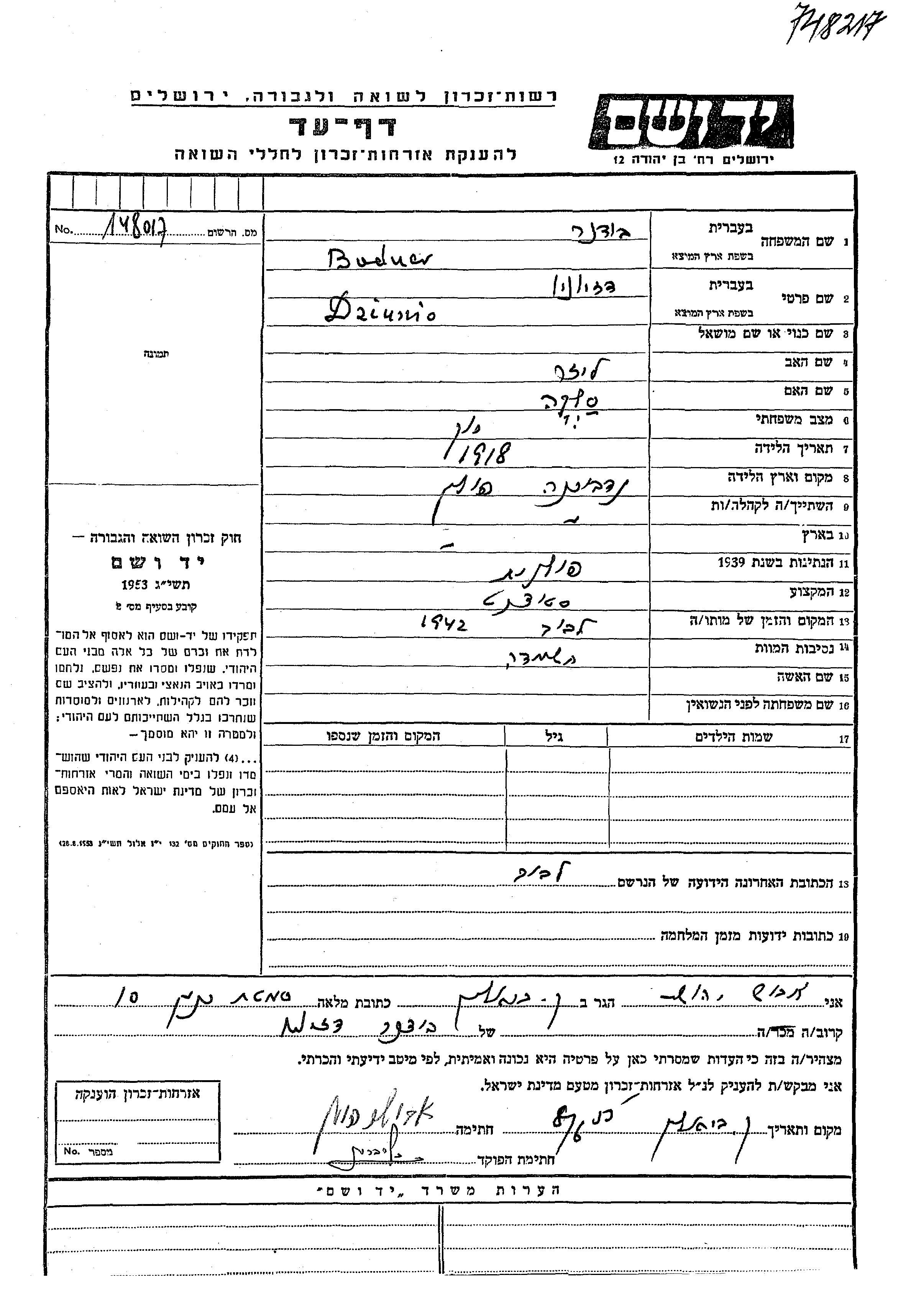 Dziunio בודנר נולד בNadworna שבפולין בשנת 1918 לליזר וסלקה. הוא היה סטודנט ורווק. לפני מלחמת העולם השניה התגורר בNadworna שבפולין. בזמן המלחמה הוא היה בLwow שבפולין.