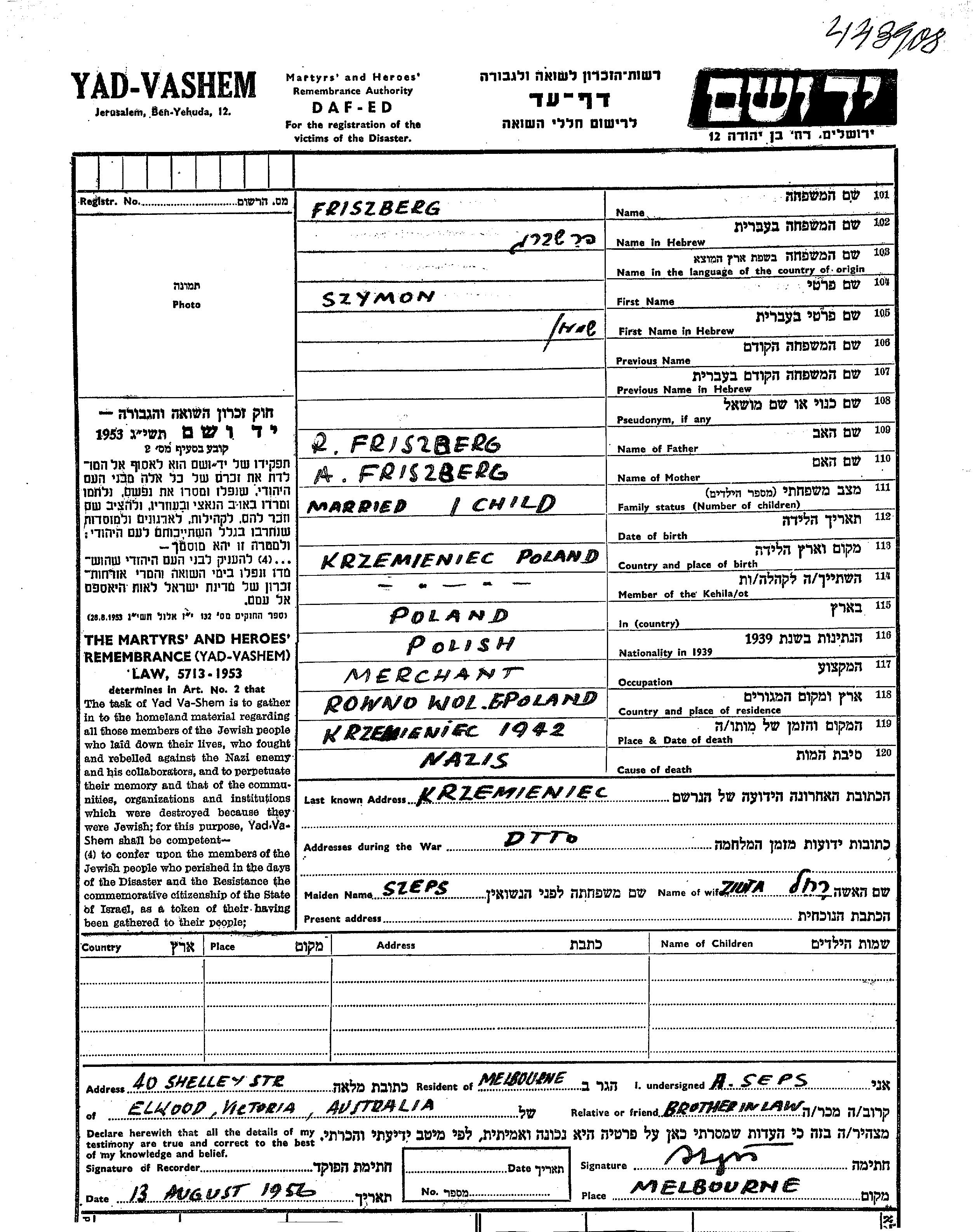Szymon Friszberg נולד בKrzemieniec שבפולין לר וא. הוא היה סוחר ונשוי לZiuta רחל לבית Szeps. לפני מלחמת העולם השניה התגורר בRowno שבפולין. בזמן המלחמה הוא היה בKrzemieniec שבפולין.