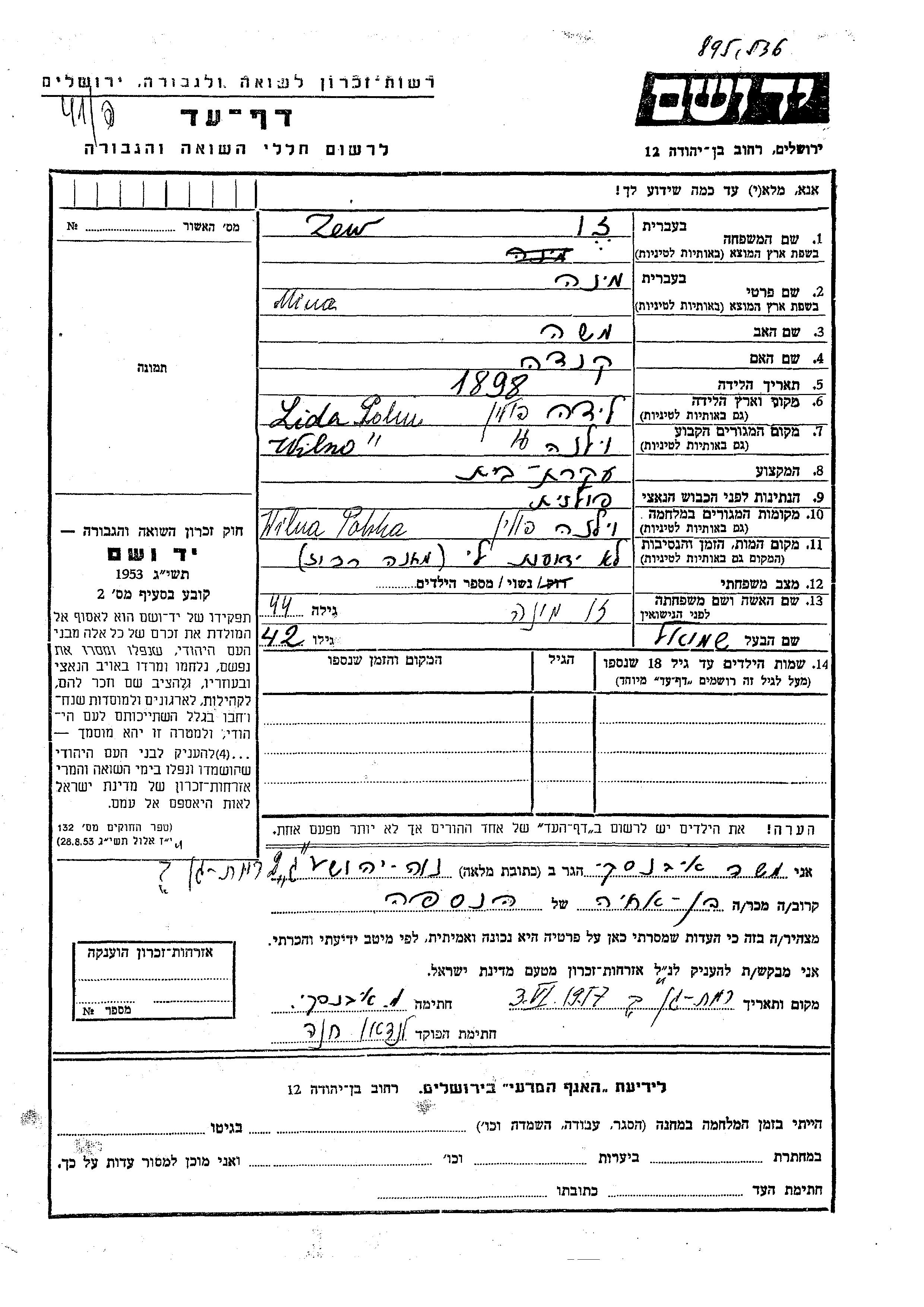 מינה Zew לבית זו נולדה בLida שבפולין בשנת 1898 למשה וקנדה. היא היתה עקרת בית ונשואה לשמואל. לפני מלחמת העולם השניה התגוררה בWilno שבפולין. בזמן המלחמה היא היתה בWilno שבפולין. מינה נרצחה בשואה.