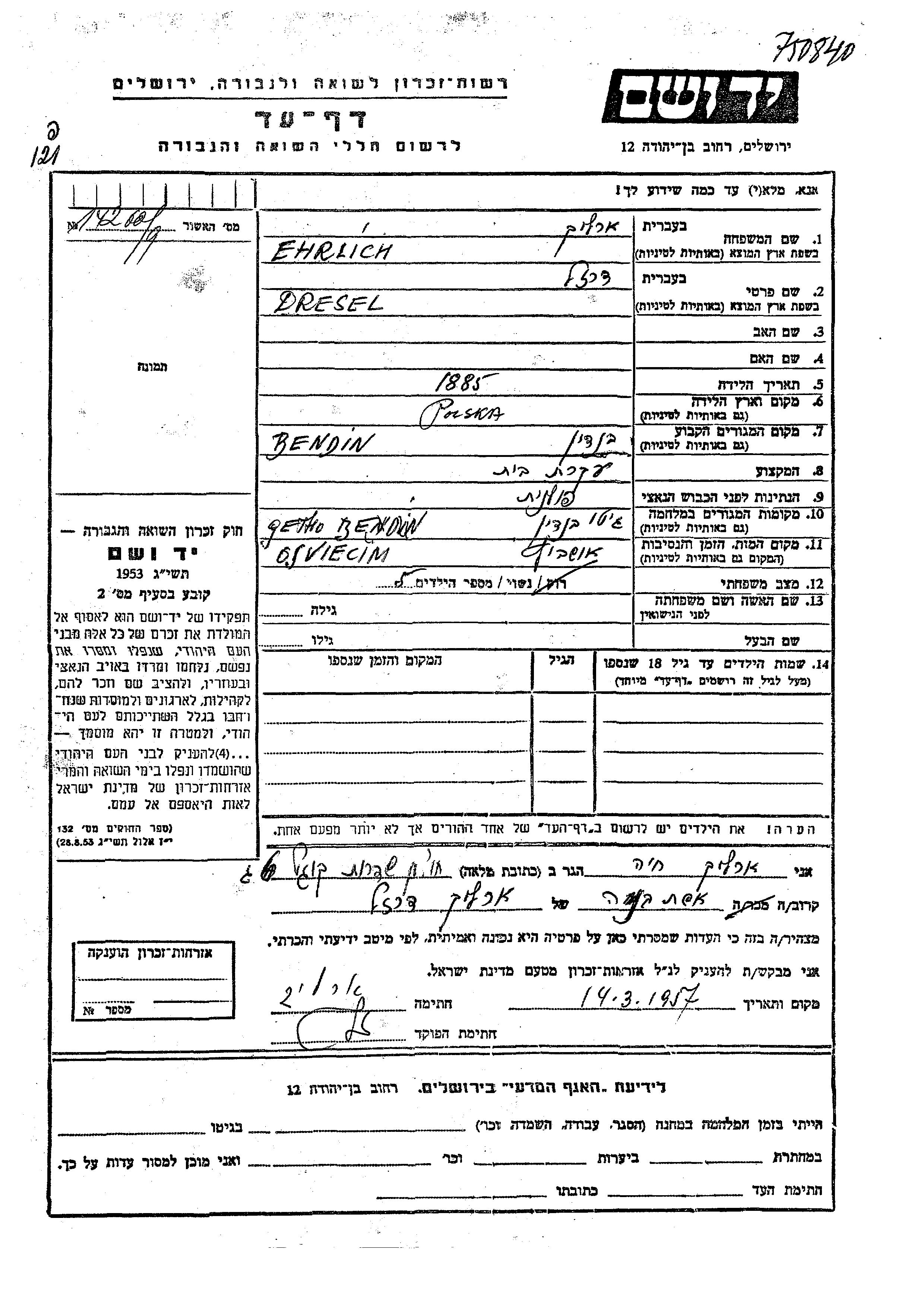 Ehrlich דרסל 1885 Bendin, פולין דף-עד