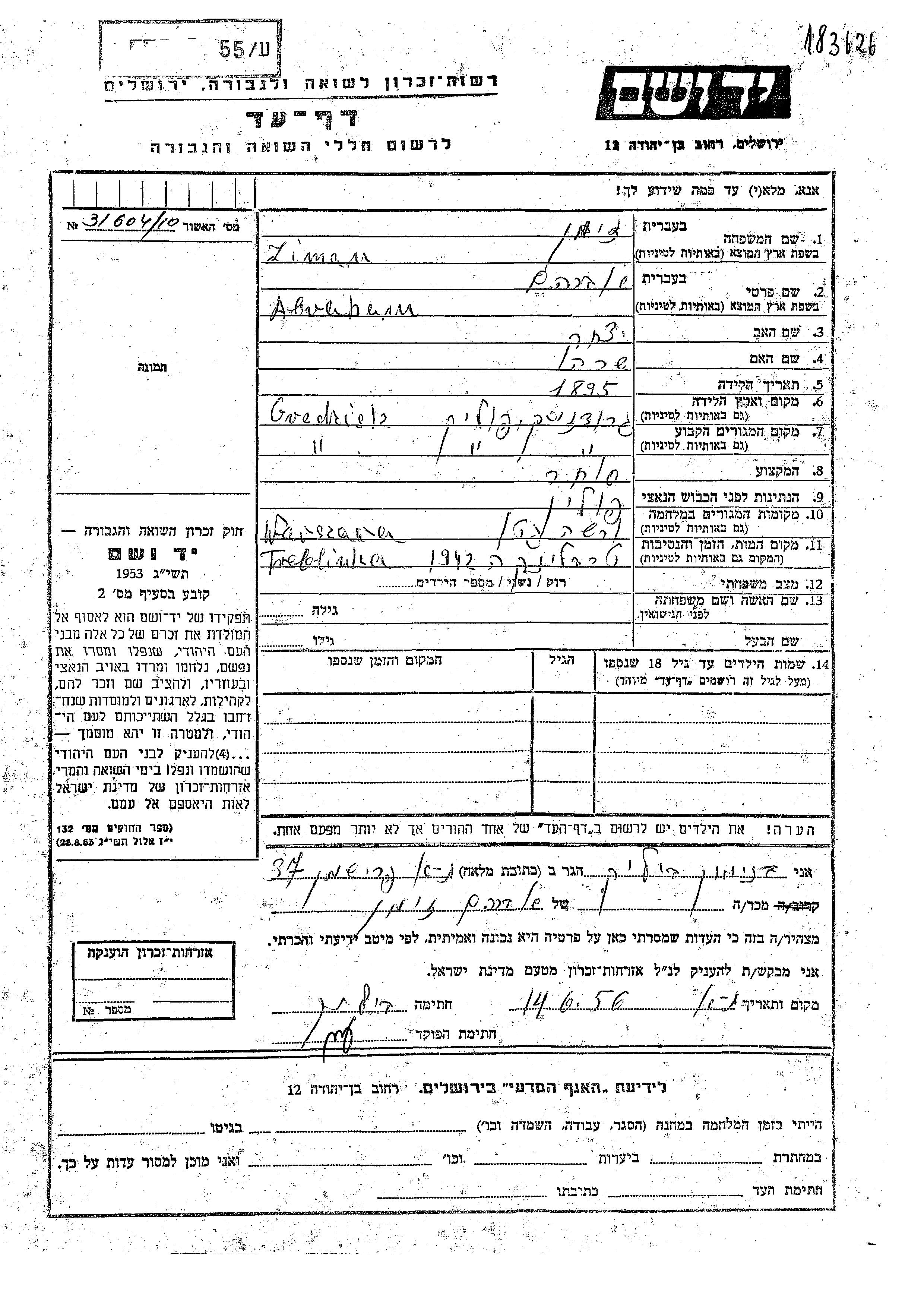 Abraham זימן נולד בGrodzisk Mazowiecki שבפולין בשנת 1895 ליצחק ושרה. הוא היה סוחר. לפני מלחמת העולם השניה התגורר בGrodzisk Mazowiecki שבפולין. בזמן המלחמה הוא היה בWarsaw שבפולין. הוא נרצח בשואה. מקום המוות: Treblinka שבפולין בשנת 1942.