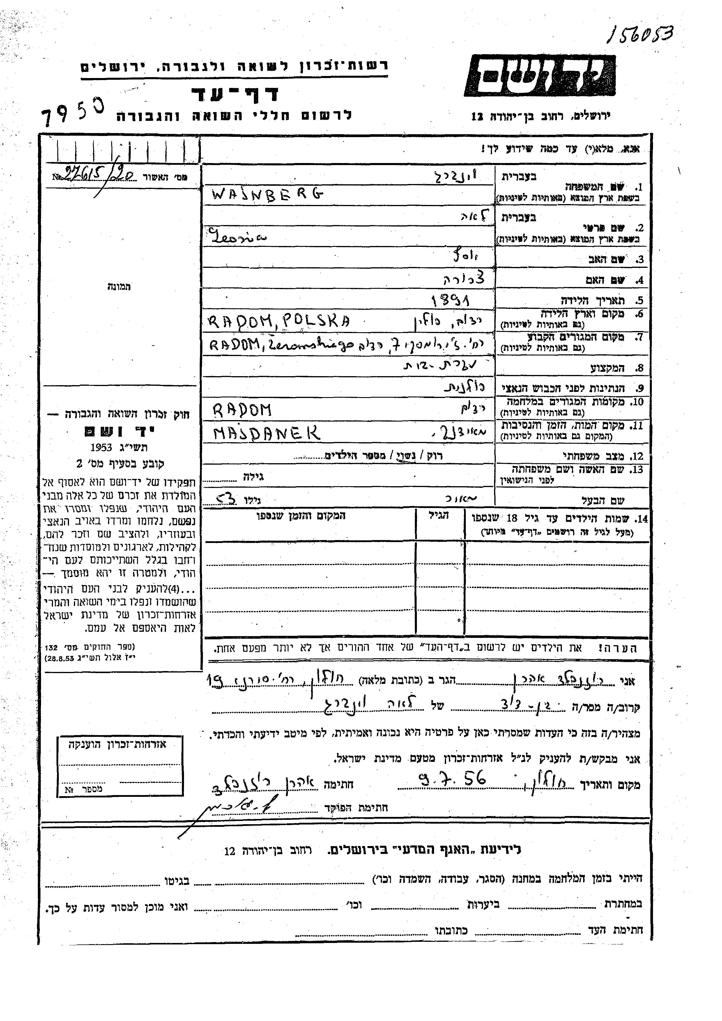 לאוניה לאה Wajnberg נולדה בRadom שבפולין בשנת 1891 ליוסף וצפורה. היא היתה עקרת בית ונשואה למאיר. לפני מלחמת העולם השניה התגוררה בRadom שבפולין. בזמן המלחמה היא היתה בRadom שבפולין. לאוניה לאה נרצחה בשואה. מקום המוות: Majdanek שבפולין.