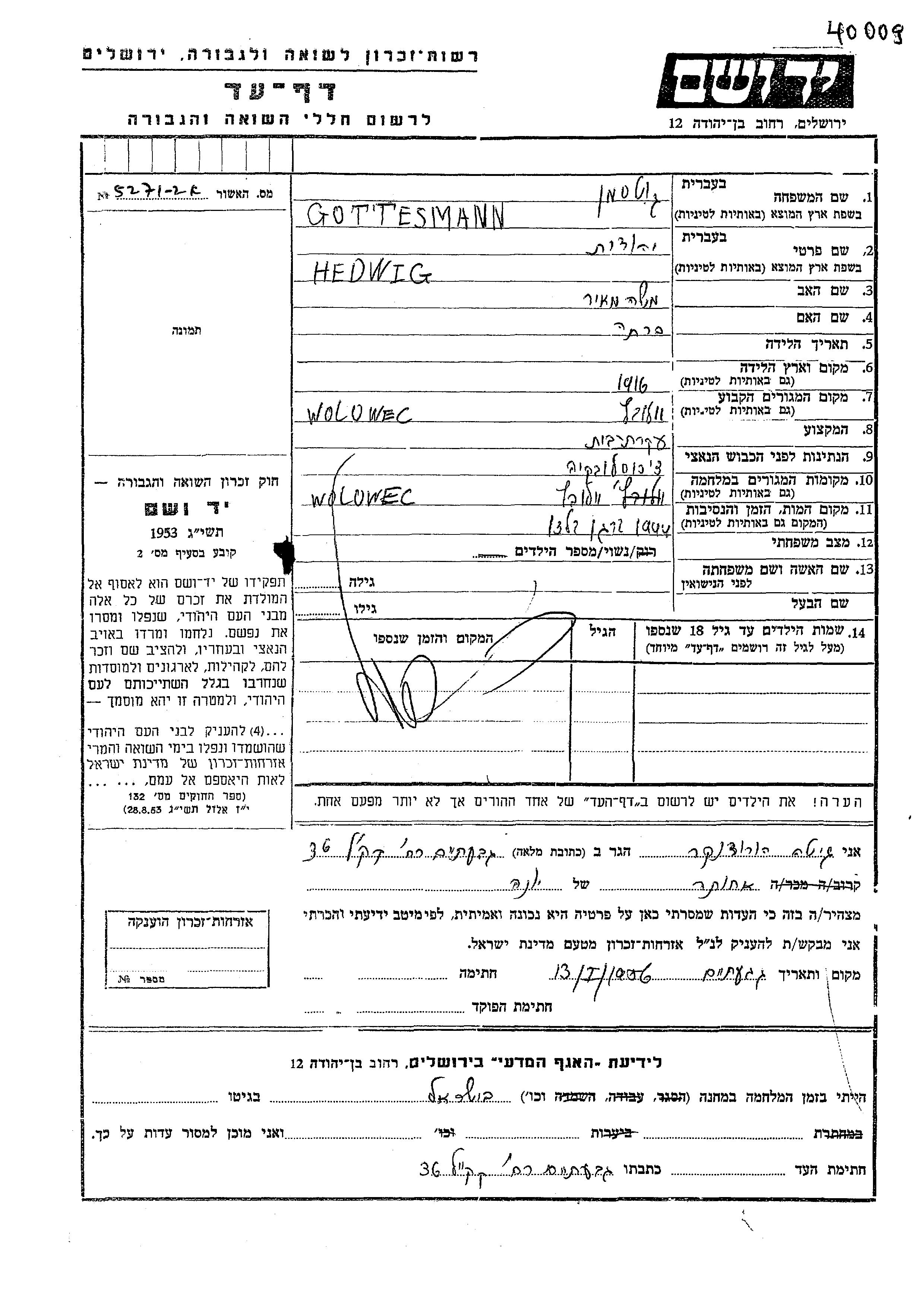 הדוויג יהודית Gottesman נולדה בWolowec שבצ'כוסלובקיה בשנת 1916 למשה מאיר וברתה. היא היתה עקרת בית ונשואה. לפני מלחמת העולם השניה התגוררה בWolowec שבצ'כוסלובקיה. בזמן המלחמה היא היתה בWolowec שבצ'כוסלובקיה.