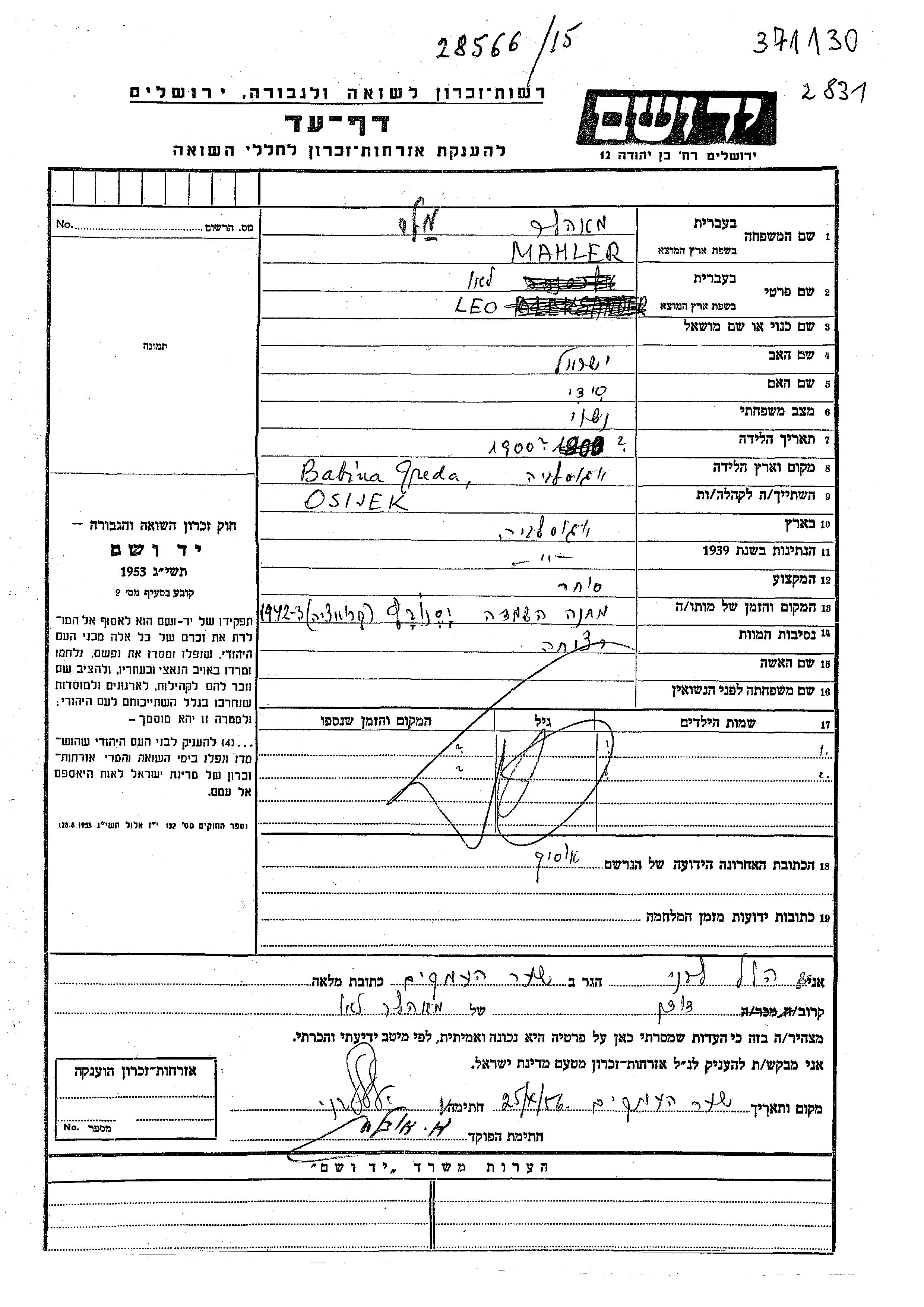 ליאו Mahler נולד בBabina Greda שביוגוסלביה בשנת 1900 לישראל וסידי. הוא היה סוחר ונשוי. לפני מלחמת העולם השניה התגורר בOsijek שביוגוסלביה. בזמן המלחמה הוא היה ביוגוסלביה. ליאו נרצח בשואה. מקום המוות: Jasenovac שביוגוסלביה בשנת 1943.