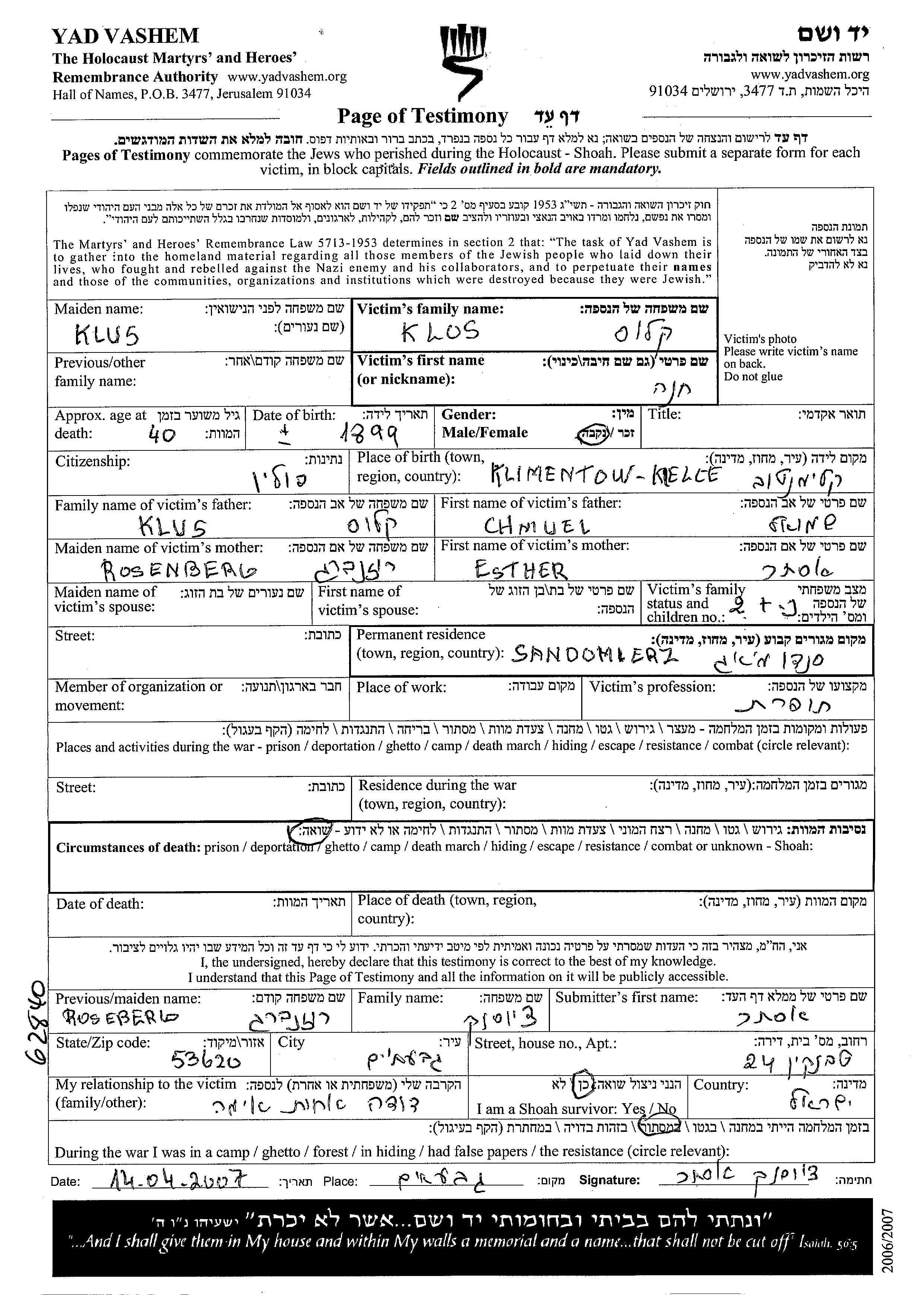 חנה קלוס Klus נולדה בKlimantow שבפולין בשנת 1899 לChmuel ואסתר לבית Rosenberg. היא היתה כובענית אופנה ונשואה. לפני מלחמת העולם השניה התגוררה בSandomierz שבפולין. חנה נרצחה בשואה.