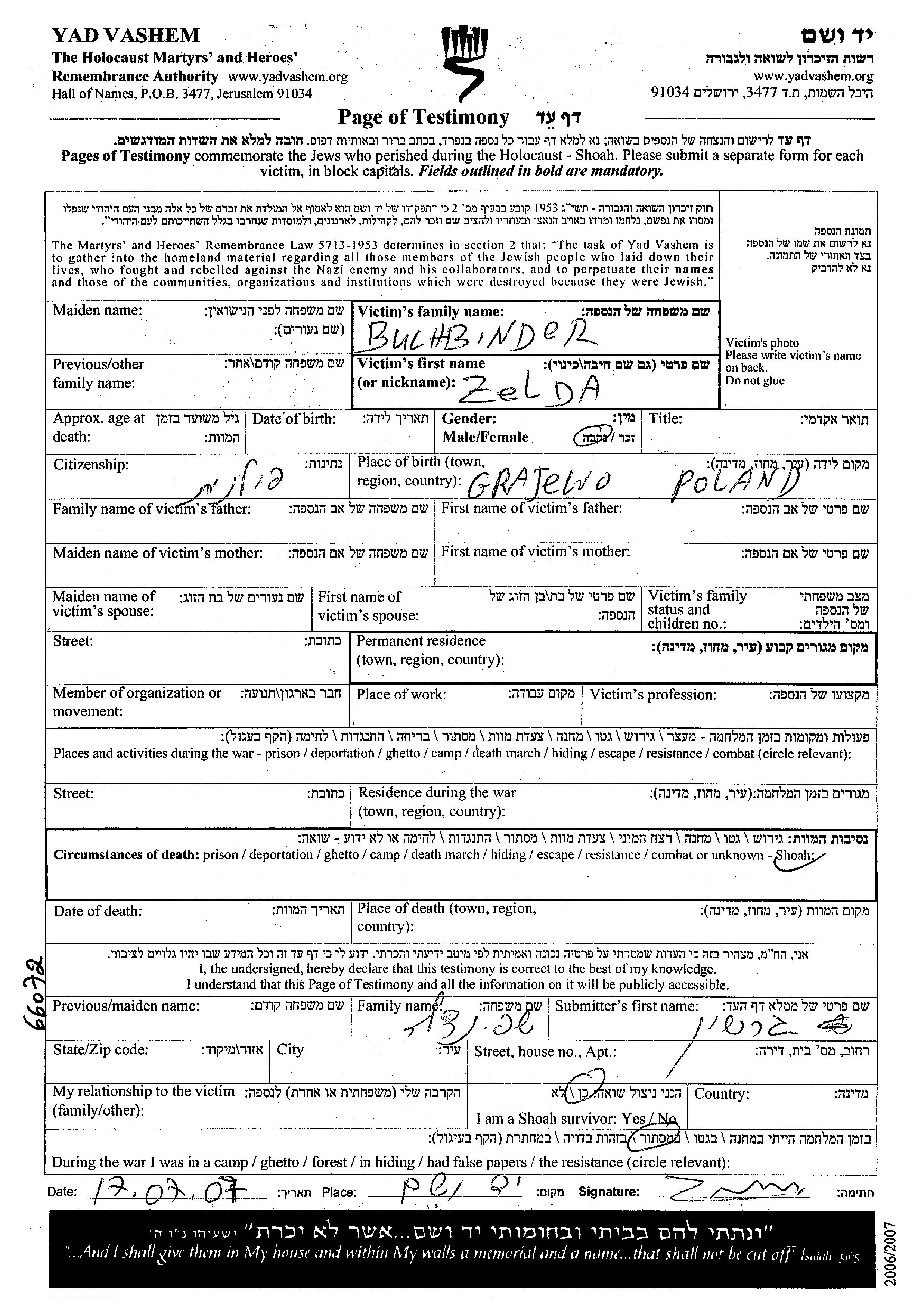 זלדה Buchbinder נולדה בGrajewo שבפולין. לפני מלחמת העולם השניה התגוררה במקום לא רשום.