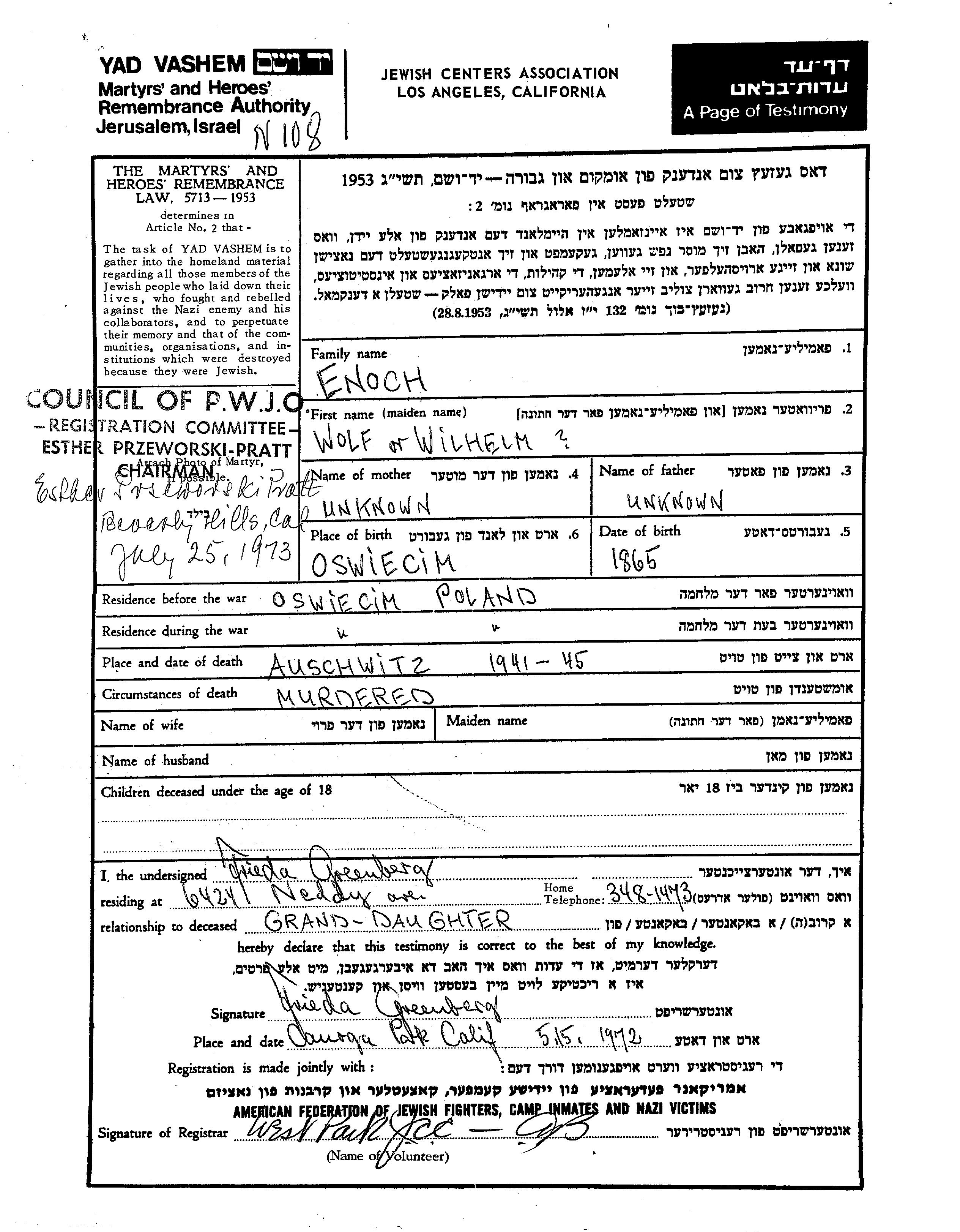 Wolf Wilhelm Enoch נולד בOświęcim שבפולין בשנת 1865. לפני מלחמת העולם השניה התגורר בOświęcim שבפולין. בזמן המלחמה הוא היה בOświęcim שבפולין.