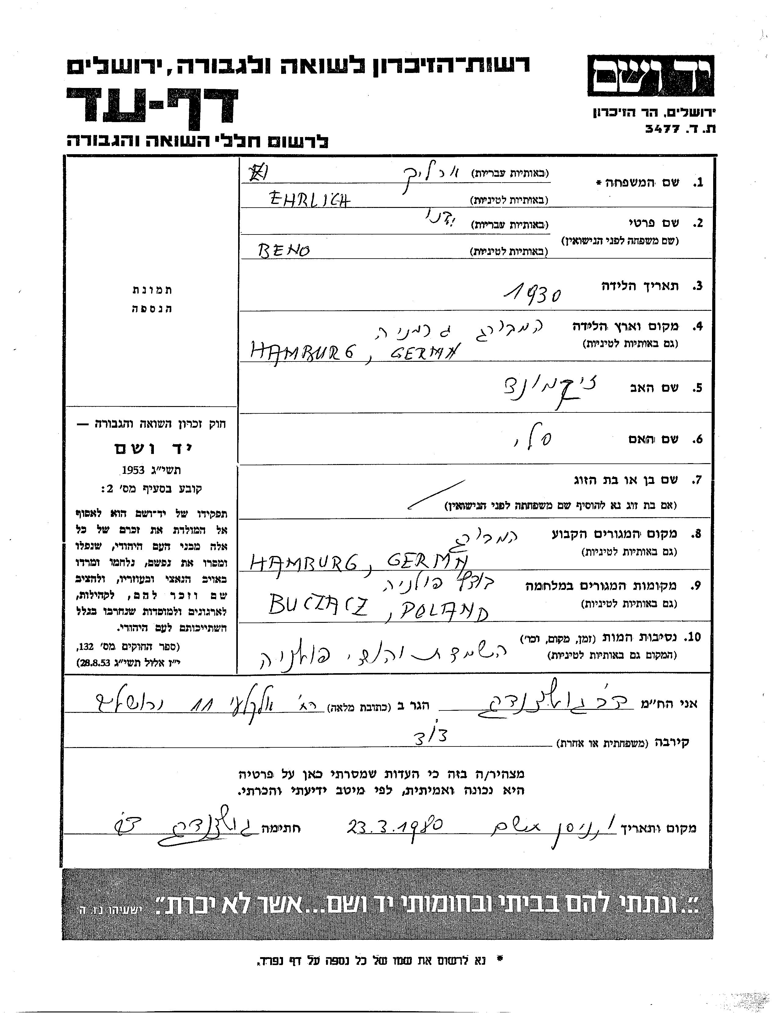 בנו Ehrlich נולד בHamburg שבגרמניה בשנת 1930 לזיקמונד וסלי. לפני מלחמת העולם השניה התגורר בHamburg שבגרמניה. בזמן המלחמה הוא היה בBuczacz שבפולין. בנו נרצח בשואה.
