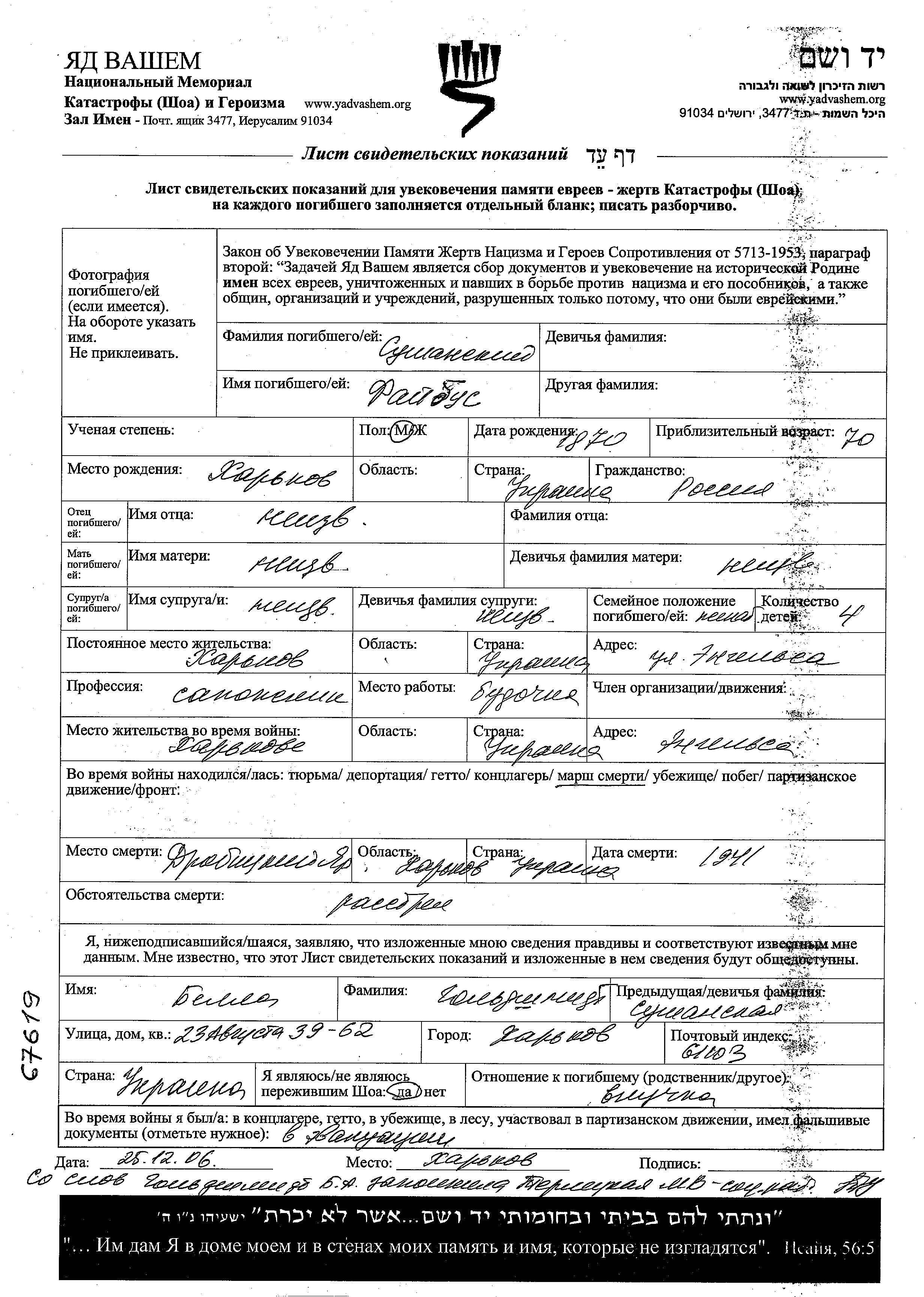 Faibus סושנסקי נולד בKharkov שבאוקראינה (ברה"מ) בשנת 1870. הוא היה סנדלר ונשוי. לפני מלחמת העולם השניה התגורר בKharkov שבאוקראינה (ברה"מ). בזמן המלחמה הוא היה בKharkov שבאוקראינה (ברה"מ). הוא נרצח בשואה. מקום המוות: Drobitskiy Yar שבאתר רצח בשנת 1941.