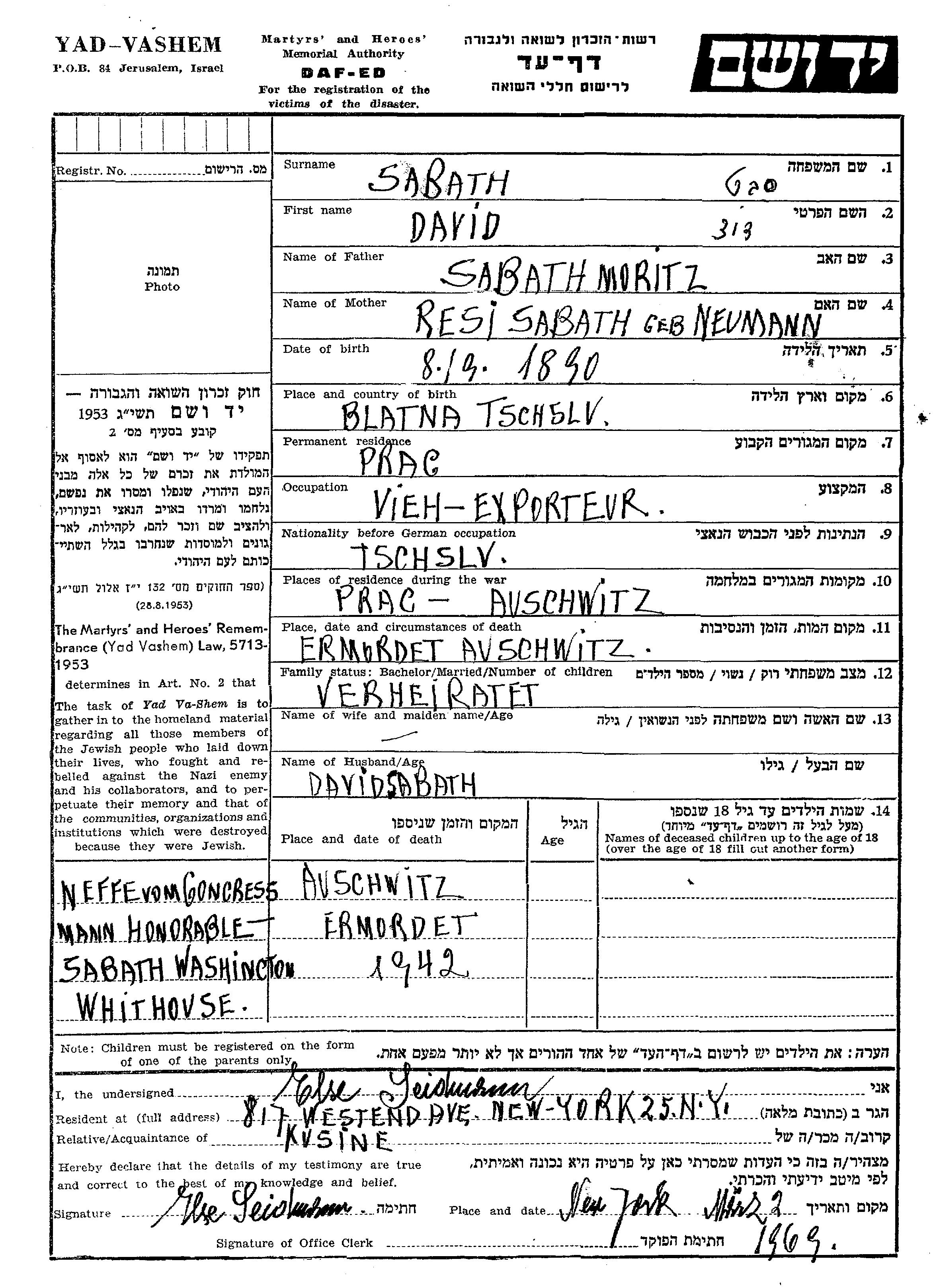 דוד Sabath נולד בBlatna שבצ'כוסלובקיה למוריץ וResi לבית Neumann. הוא היה Viehexporteur. לפני מלחמת העולם השניה התגורר בPrag שבצ'כוסלובקיה. בזמן המלחמה הוא היה בPrag שבצ'כוסלובקיה. דוד נרצח בשואה. מקום המוות: Auschwitz שבפולין.
