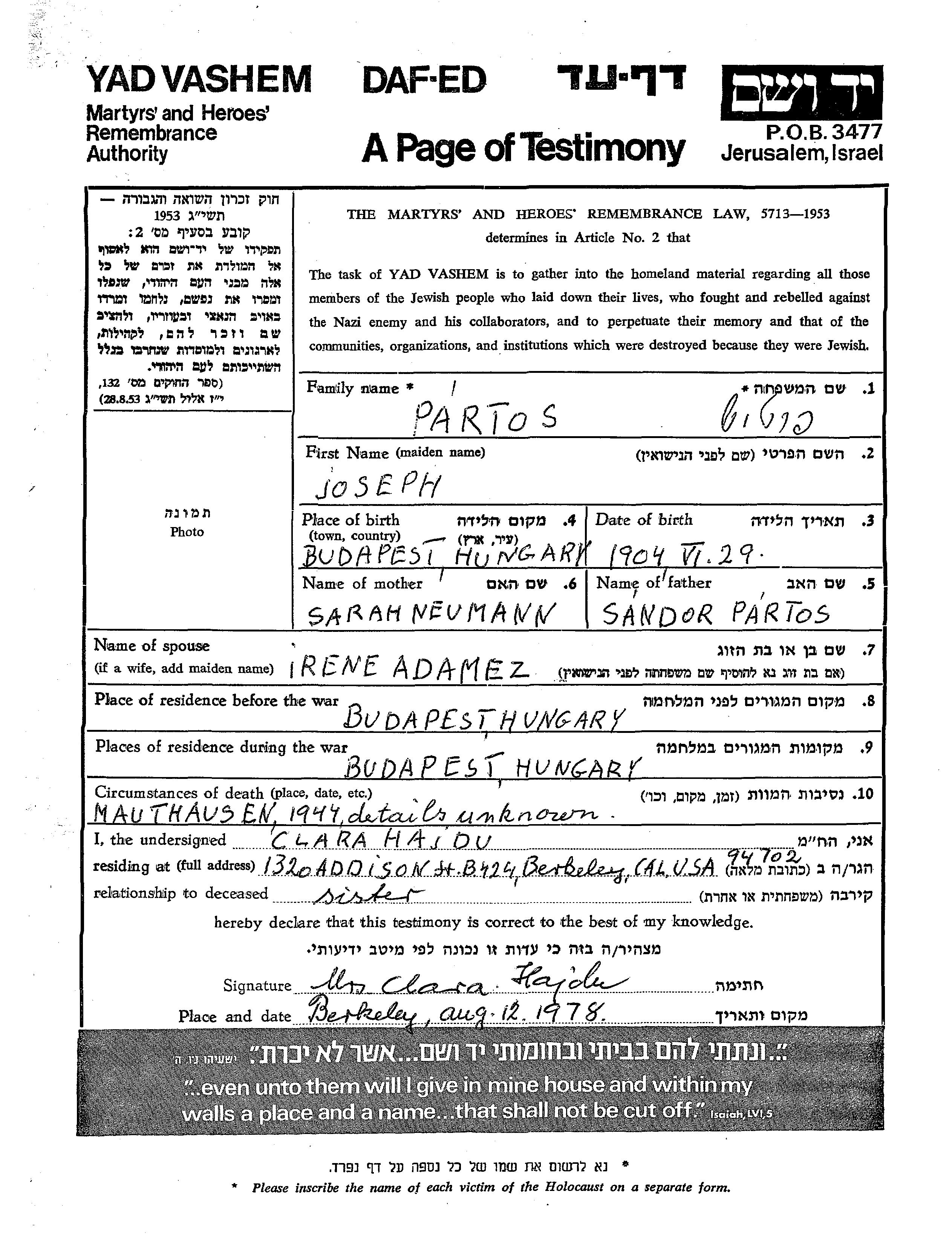 יוסף נרצח בשואה. מקום המוות: Mauthausen שבאוסטריה בשנת 1944.