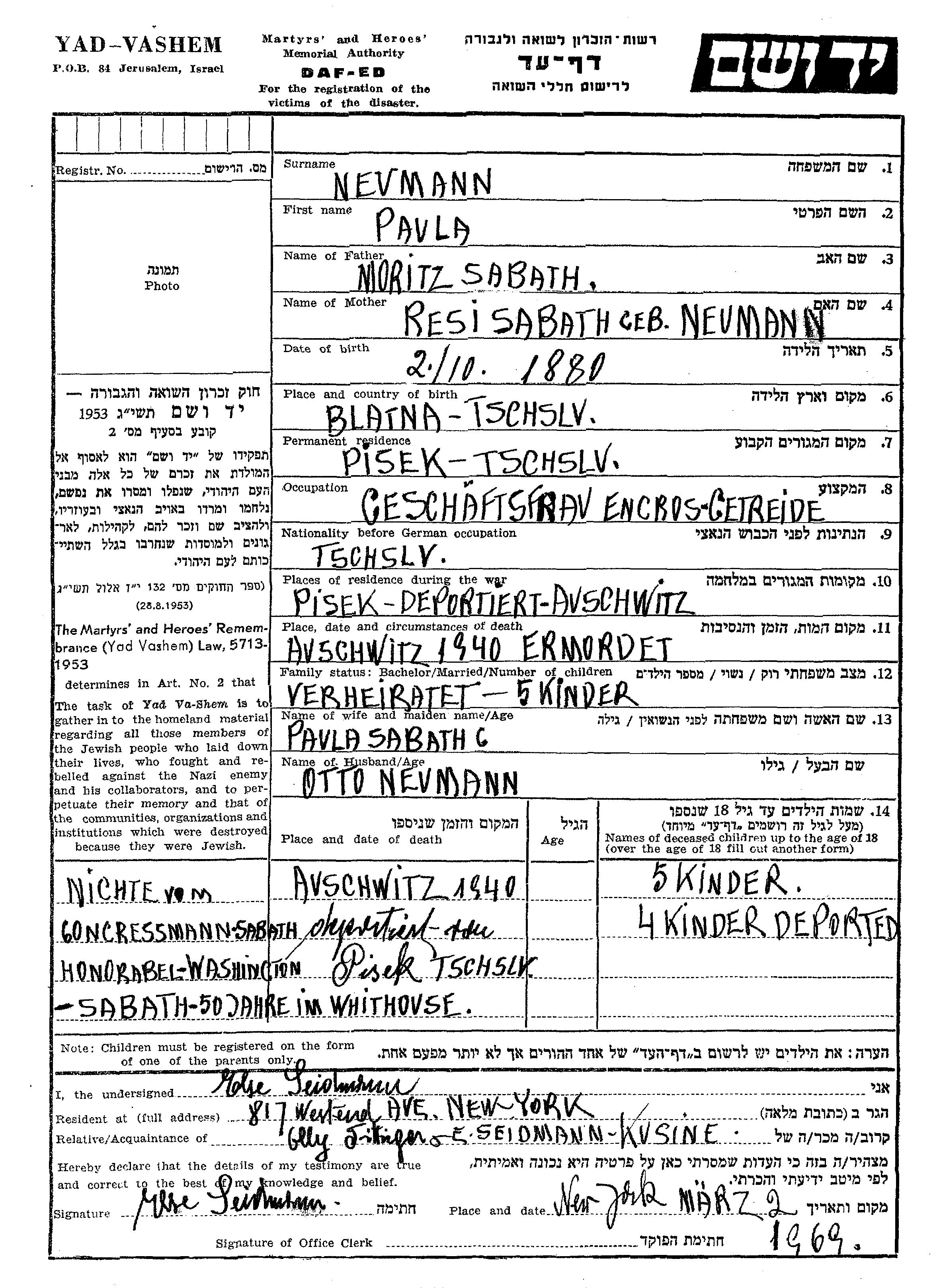 פאולה Neumann לבית Sabath נולדה בBlatna שבצ'כוסלובקיה בשנת 1880 למוריץ וResi. היא היתה בעלת עסק ונשואה לאוטו. לפני מלחמת העולם השניה התגוררה בPisek שבצ'כוסלובקיה. בזמן המלחמה היא היתה בPisk שבפולין. פאולה נרצחה בשואה. מקום המוות: Auschwitz שבפולין בשנת 1940.