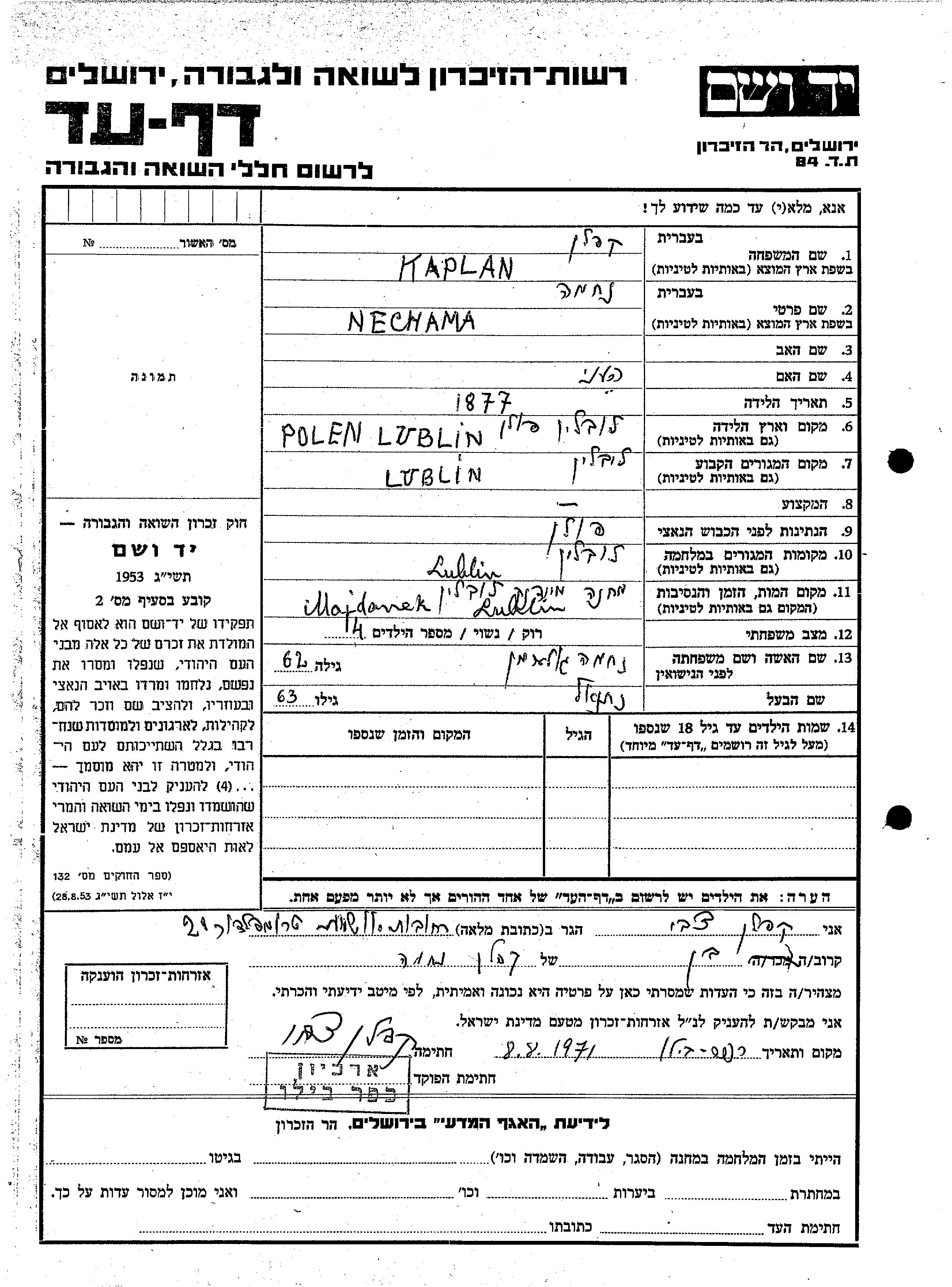 Nechama קפלן לבית גולדמן נולדה בLublin שבפולין בשנת 1877 להעני. היא היתה נשואה לנתנאל. לפני מלחמת העולם השניה התגוררה בLublin שבפולין. בזמן המלחמה היא היתה בLublin שבפולין. היא נרצחה בשואה. מקום המוות: Majdanek שבפולין.