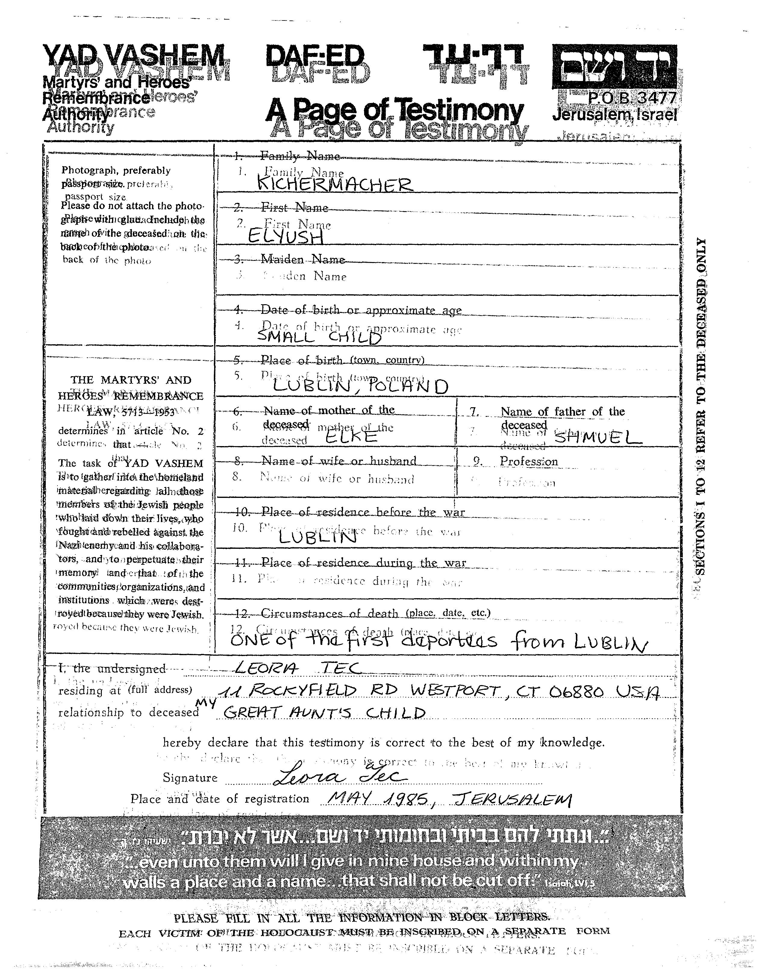 Elyush Kichermacher נולד בLublin שבפולין לשמואל וElke. הוא היה ילד. לפני מלחמת העולם השניה התגורר בLublin שבפולין. בזמן המלחמה הוא היה בLublin שבפולין. הוא נרצח בשואה.