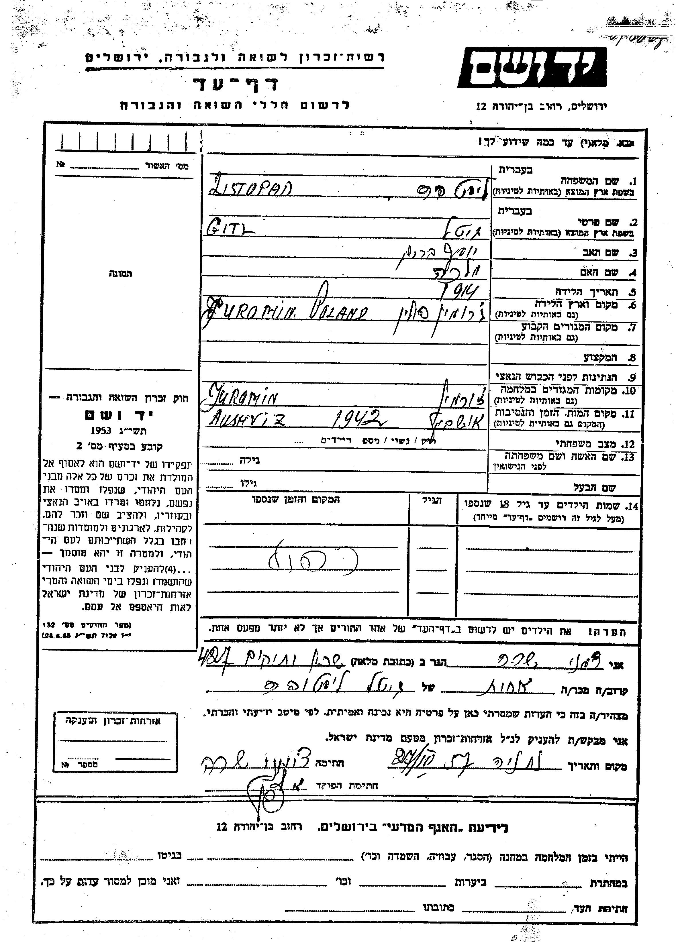 Gitl ליסטופד נולדה בZuromin שבפולין בשנת 1914 ליוסף ומלכה. לפני מלחמת העולם השניה התגוררה בZuromin שבפולין. היא נרצחה בשואה. מקום המוות: Oświęcim שבפולין בשנת 1942.