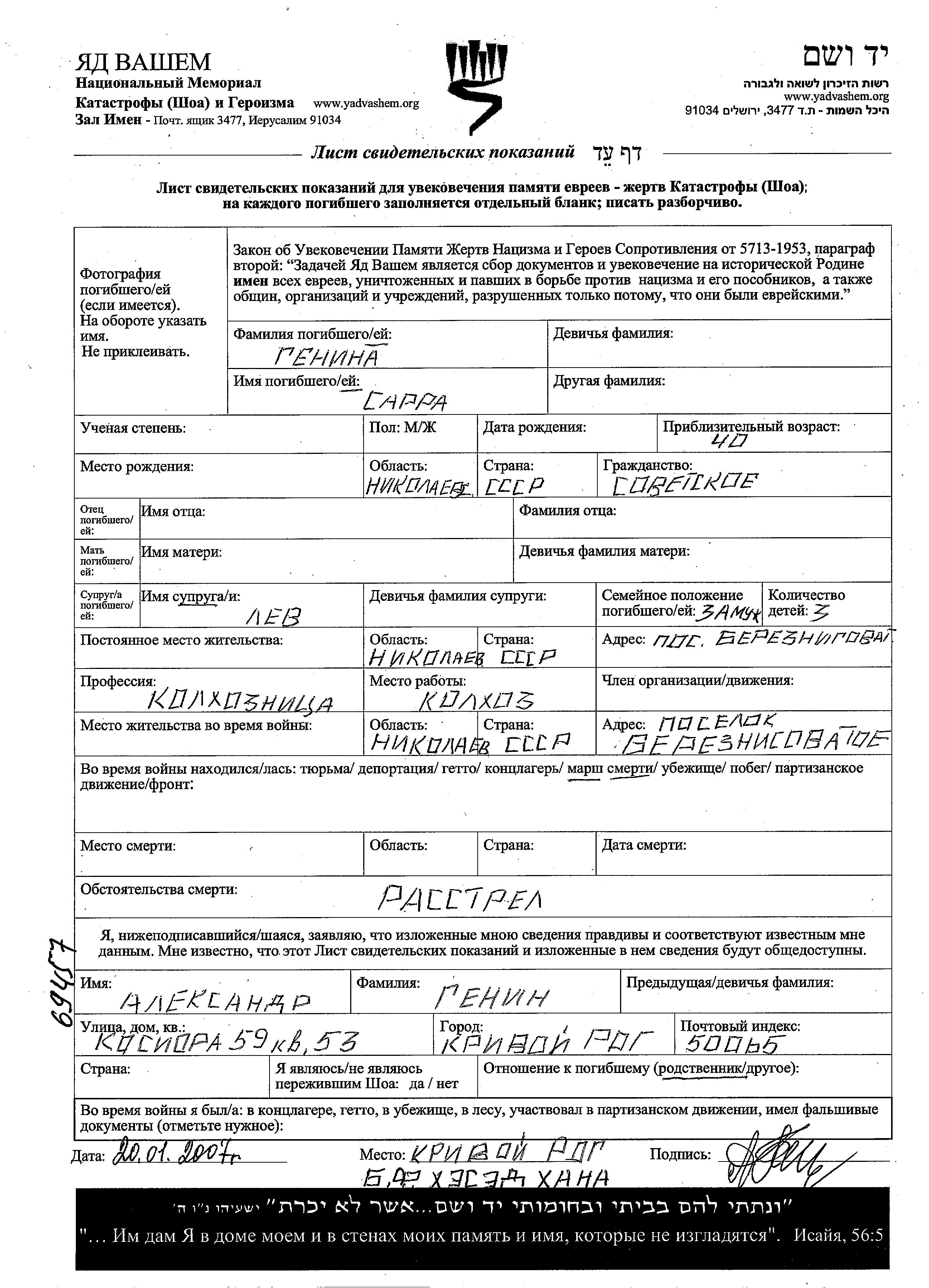 Sarra Genina נולדה בNikolayev שבאוקראינה (ברה"מ). היא היתה קולחוזניקית ונשואה ללב. לפני מלחמת העולם השניה התגוררה בBereznigovatoye שבאוקראינה (ברה"מ). בזמן המלחמה היא היתה בBereznigovatoye שבאוקראינה (ברה"מ). היא נרצחה בשואה.