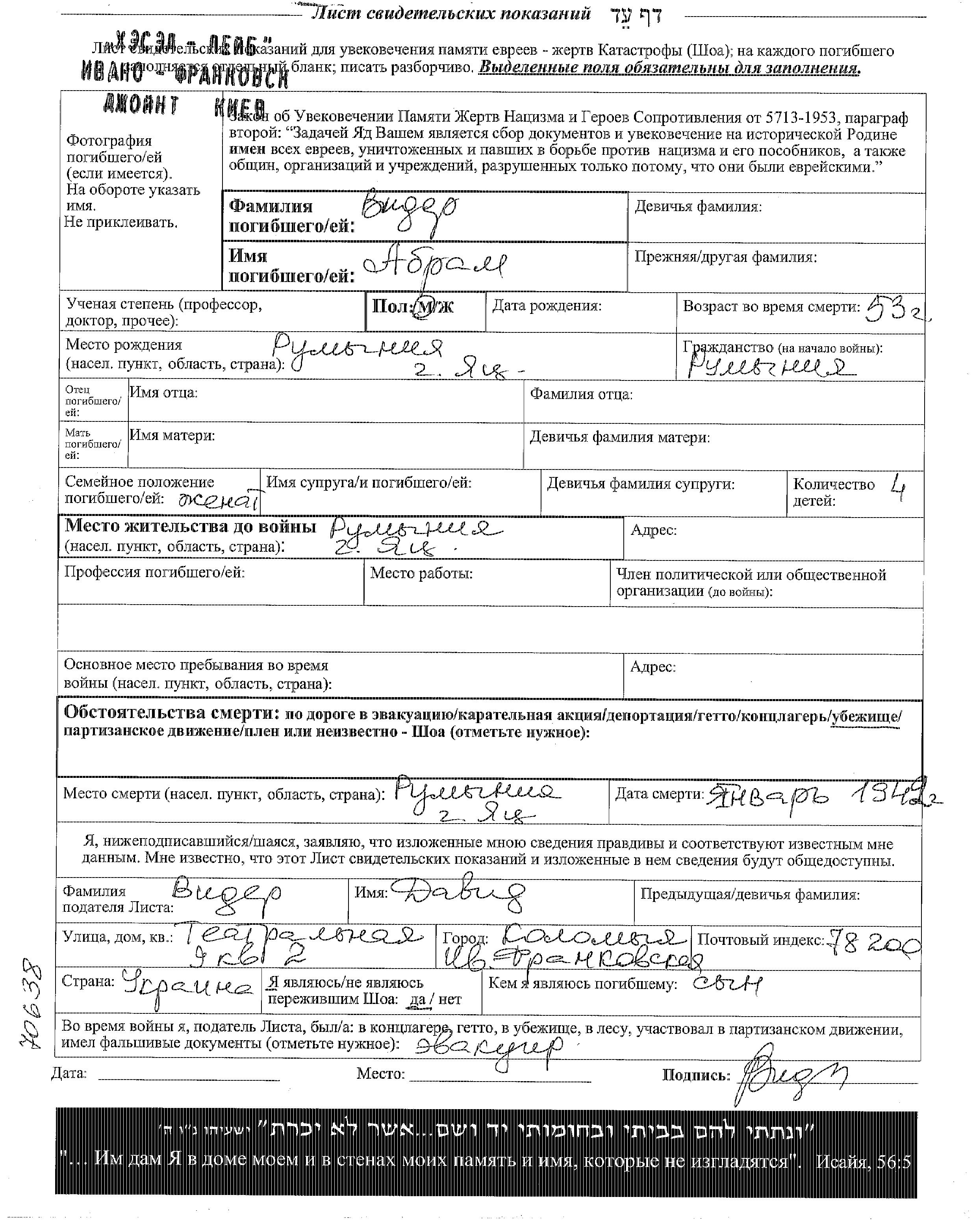 אברם נרצח בשואה. מקום המוות: Iasi שברומניה בשנת 01/1942.