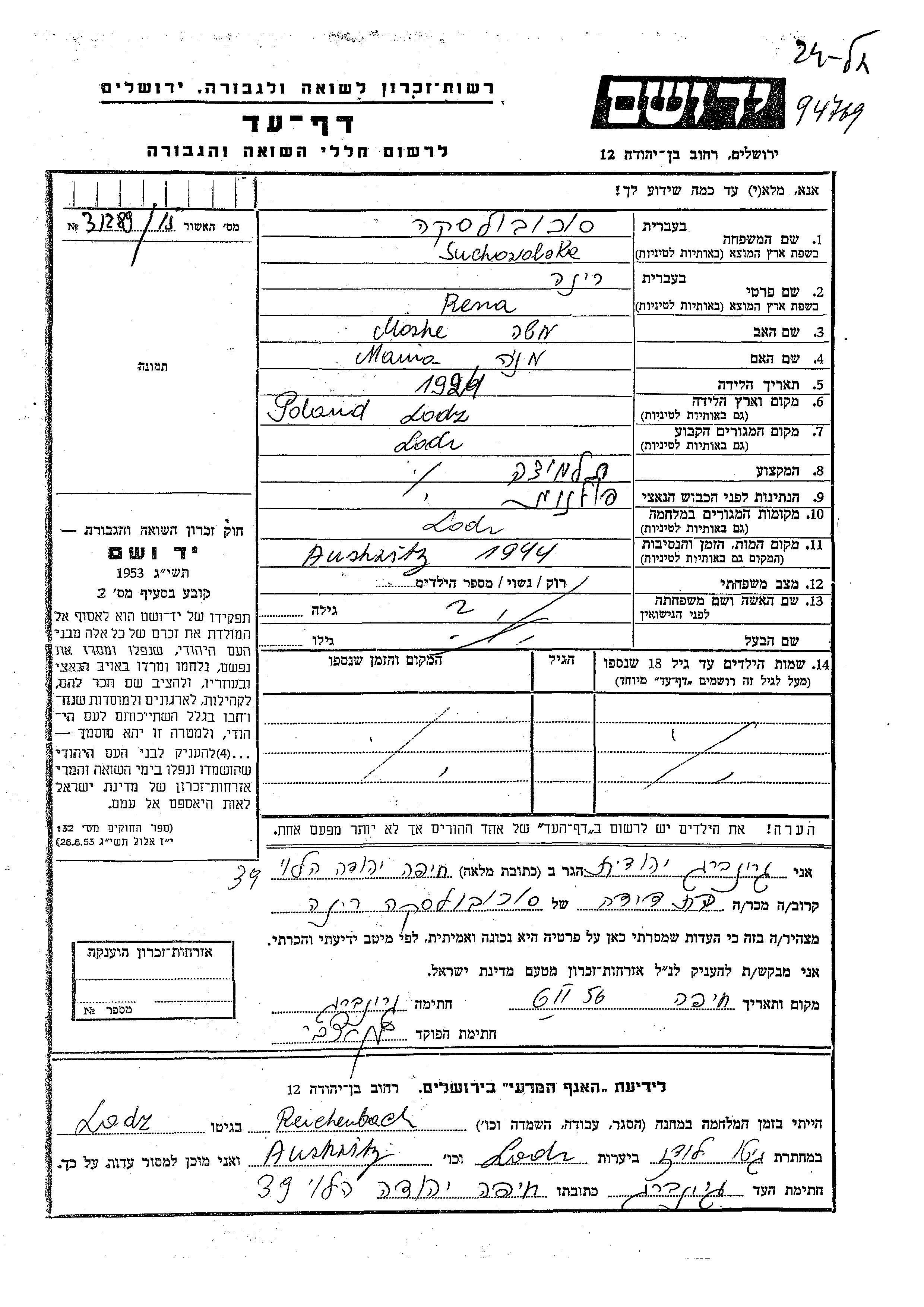 רנה רינה Suchowolska נולדה בLodz שבפולין בשנת 1924 למשה ומניה. היא היתה תלמידה. לפני מלחמת העולם השניה התגוררה בLodz שבפולין. בזמן המלחמה היא היתה בLodz שבפולין.