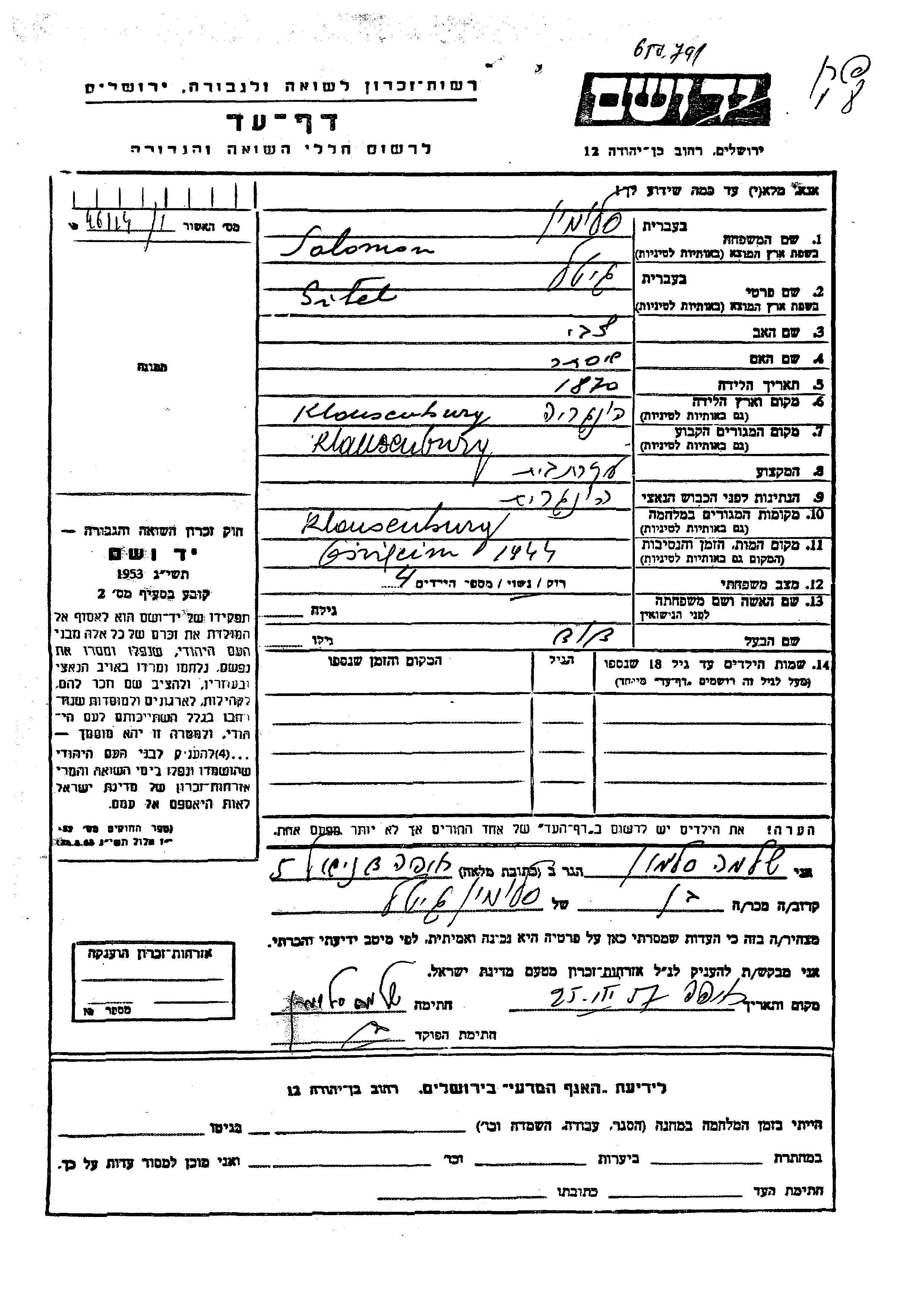 גיטל סלומון נולדה בKlausenburg שברומניה בשנת 1870 לצבי ואסתר. היא היתה עקרת בית ונשואה לדוד. לפני מלחמת העולם השניה התגוררה בKlausenburg שברומניה. בזמן המלחמה היא היתה בKlausenburg שברומניה. גיטל נרצחה בשואה. מקום המוות: Oshvitzin שבפולין בשנת 1944.