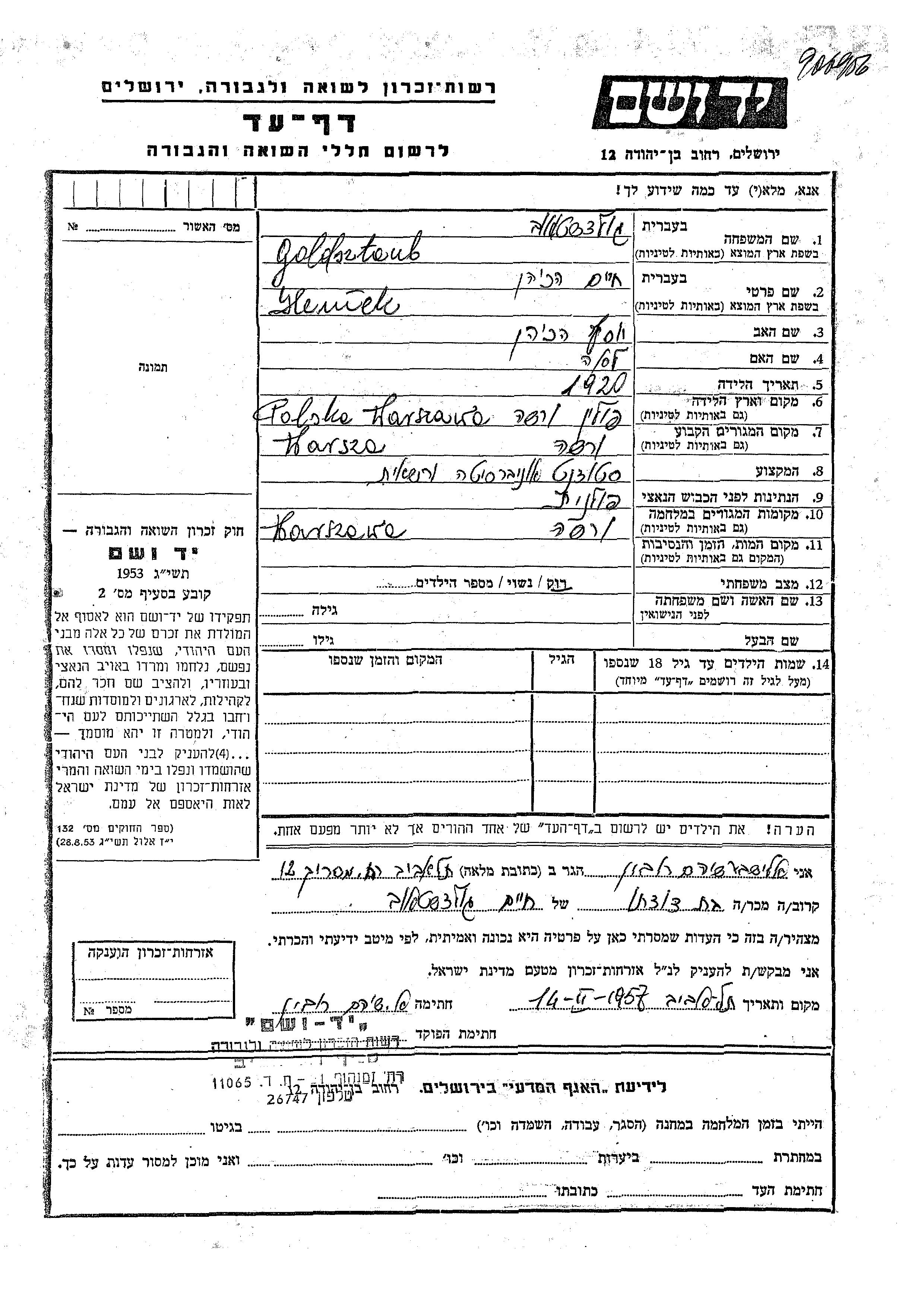 Goldsztaub Hemiek חיים 1920 Warszawa, פולין דף-עד