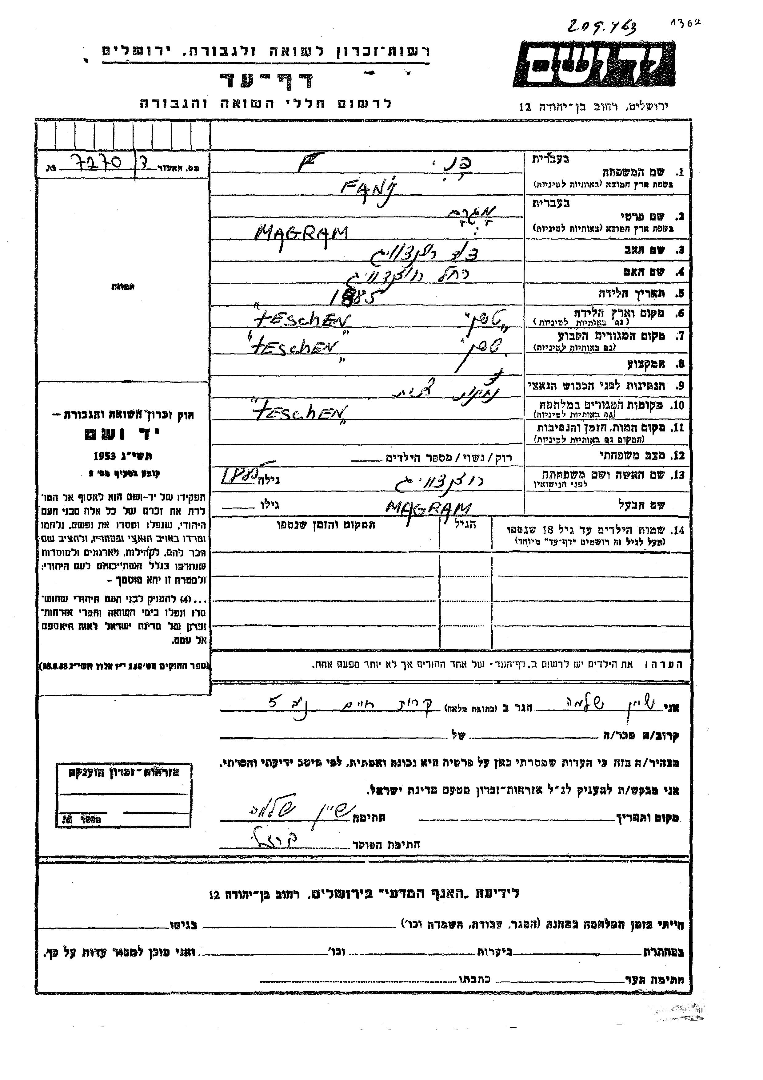 Fanj פני מגרם לבית רוזנצוויג נולדה בTeschen שבצ'כוסלובקיה בשנת 1885 לדוד ורחל. לפני מלחמת העולם השניה התגוררה בTeschen שבצ'כוסלובקיה. בזמן המלחמה היא היתה בTeschen שבצ'כוסלובקיה. היא נרצחה בשואה.