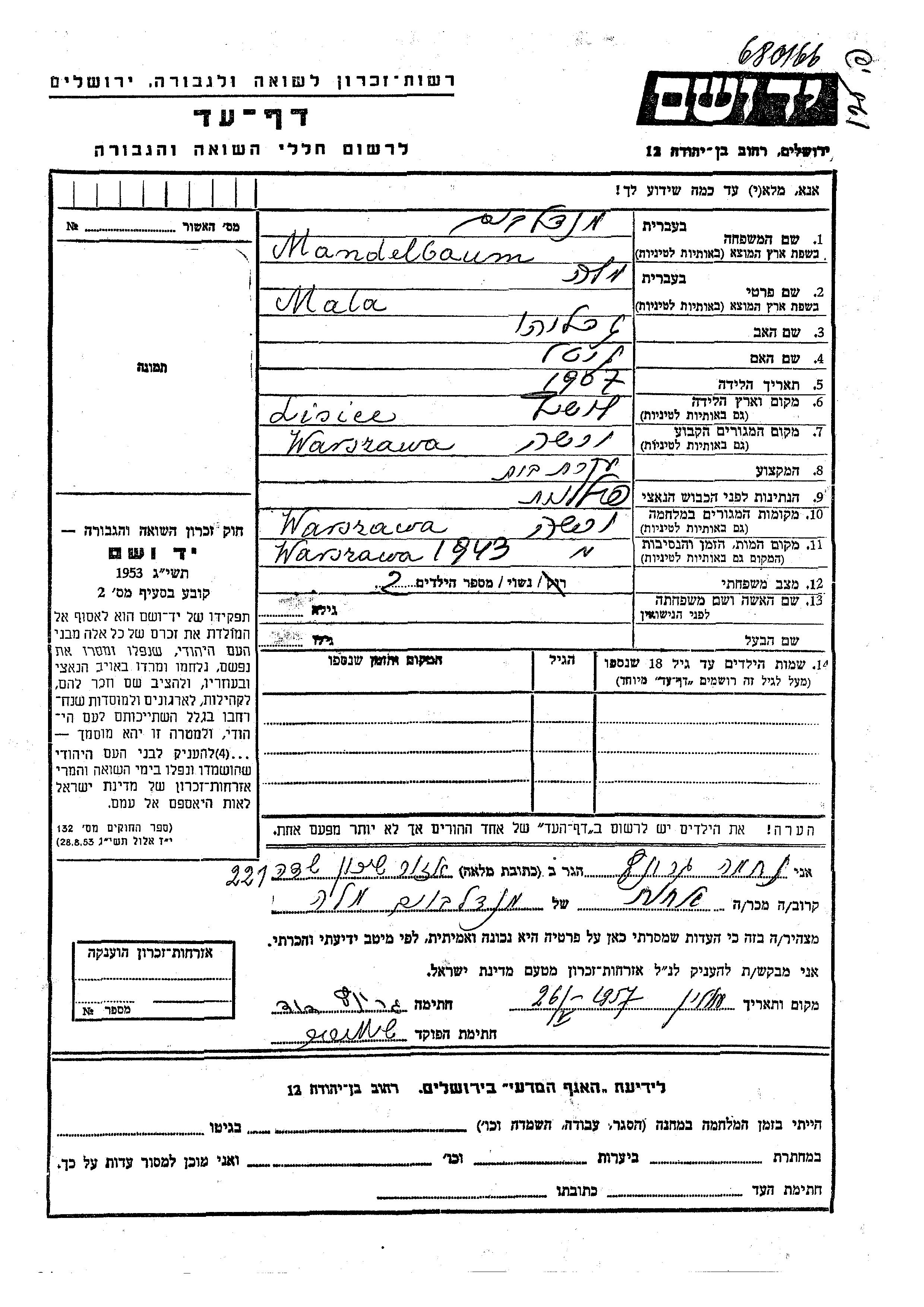 Mala מנדלבאום נולדה בLisitz שבפולין בשנת 1907 לגדליהו וגיטל. היא היתה עקרת בית ונשואה. לפני מלחמת העולם השניה התגוררה בWarsaw שבפולין. בזמן המלחמה היא היתה בWarsaw שבפולין.