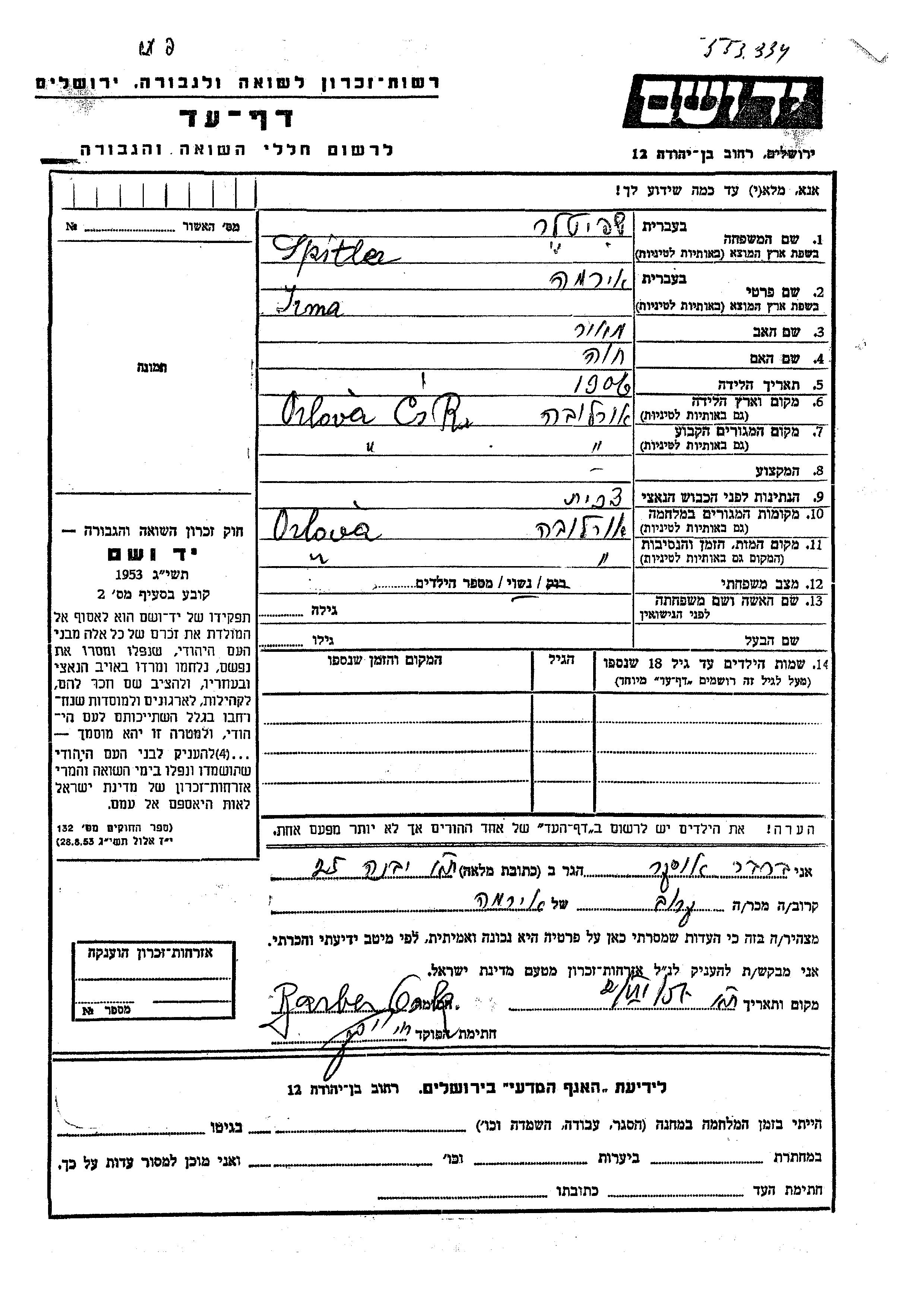 אירמה Spitler נולדה בOrlova שבצ'כוסלובקיה בשנת 1906 למאיר וחוה. היא היתה נשואה. לפני מלחמת העולם השניה התגוררה בOrlova שבצ'כוסלובקיה. בזמן המלחמה היא היתה בOrlova שבצ'כוסלובקיה.