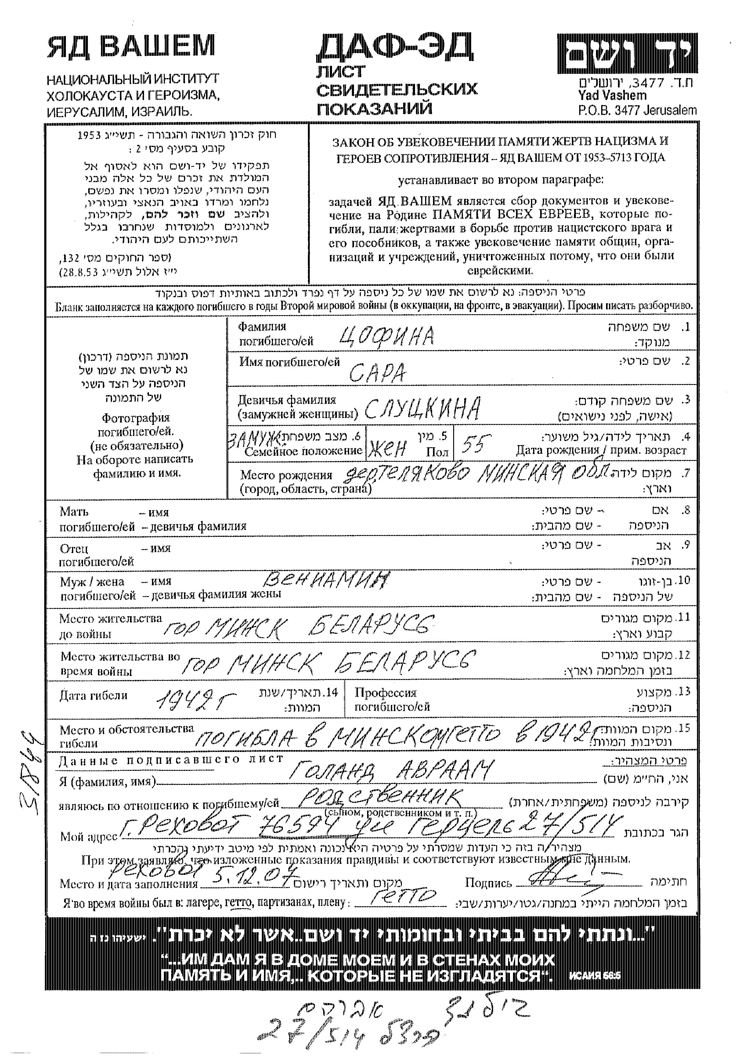 שרה Tzofina לבית Slutzkina נולד/ה בTelyakovo שבביאלורוסיה (ברה"מ). הוא/היא היה/היתה נשוי/נשואה לVeniamin. לפני מלחמת העולם השניה התגורר/התגוררה בMinsk שבביאלורוסיה (ברה"מ). בזמן המלחמה הוא/היא היה/היתה בMinsk שבביאלורוסיה (ברה"מ). שרה נרצח/ה בשואה. מקום המוות: Minsk שבביאלורוסיה (ברה"מ) בשנת 1942.