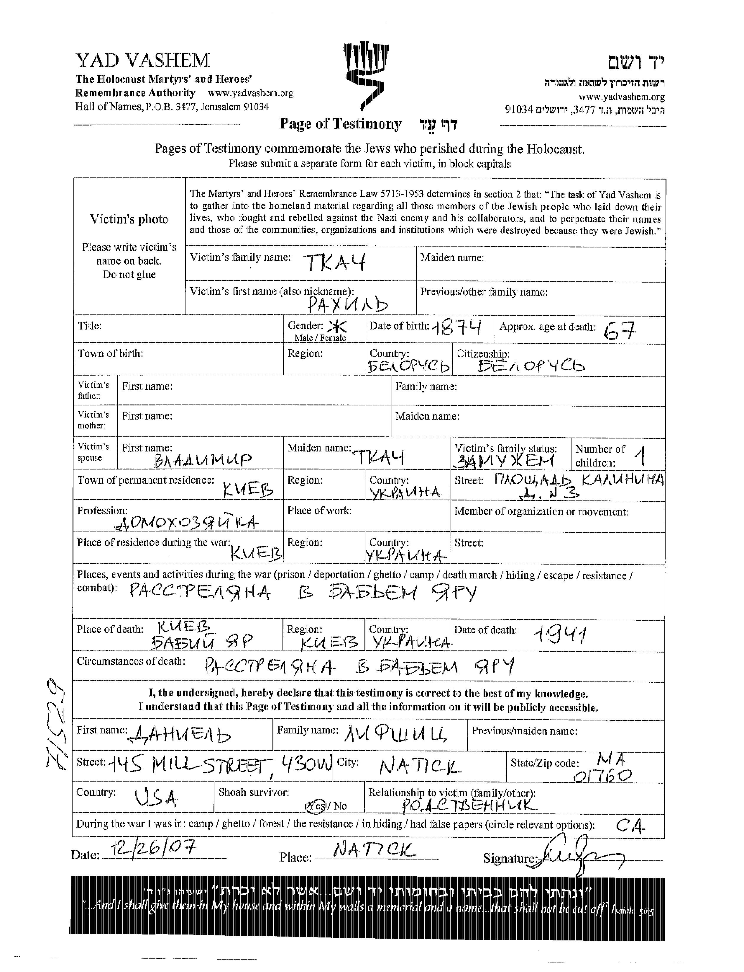 חיפוש שם מוסר דף העד. חיפוש לפי כל שם פרטי, כולל כינוי או שם חיבה