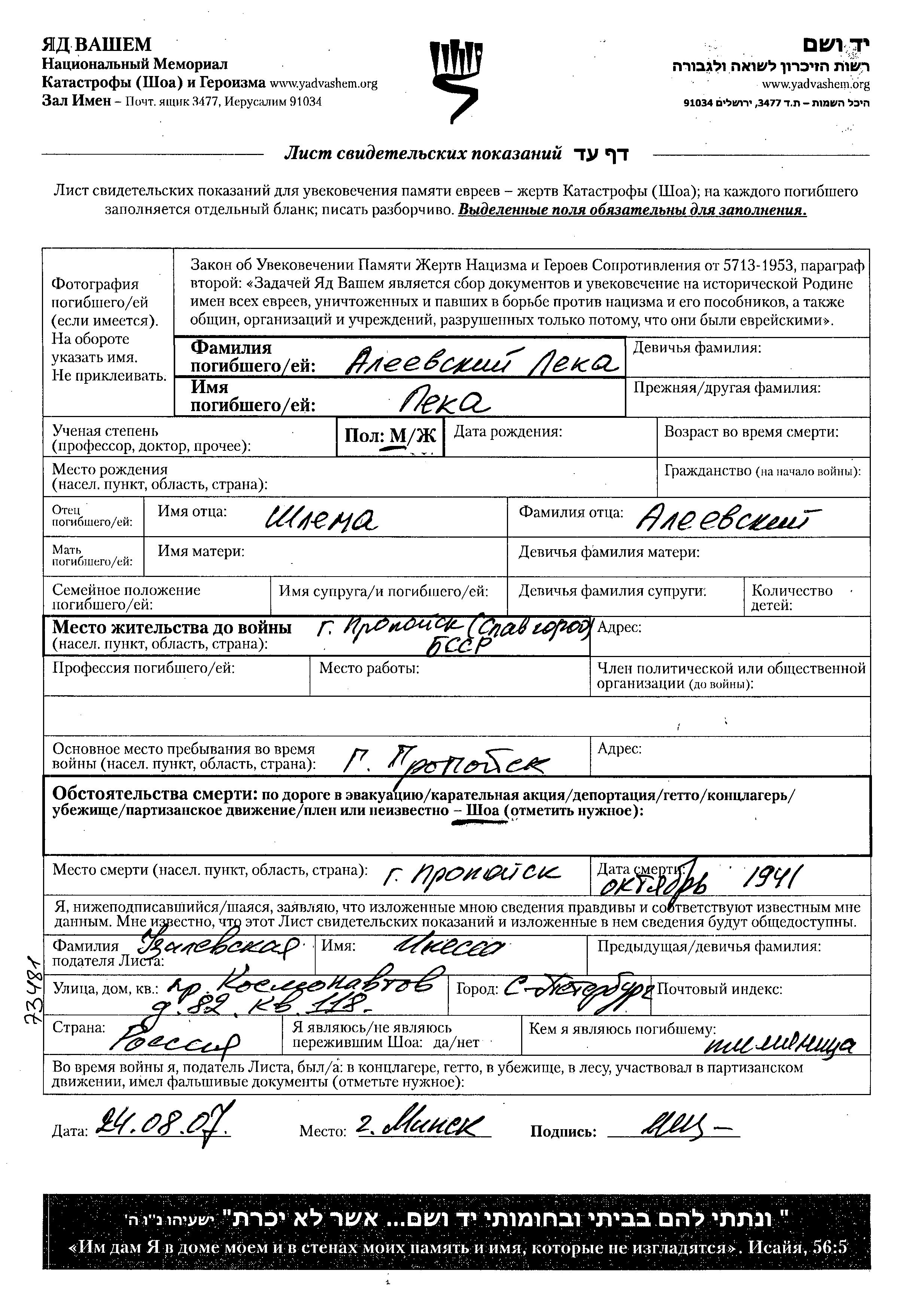 Leka Aleyevski נולד לShlema. לפני מלחמת העולם השניה התגורר בPropoysk שבביאלורוסיה (ברה"מ). בזמן המלחמה הוא היה בPropoysk שבביאלורוסיה (ברה"מ).