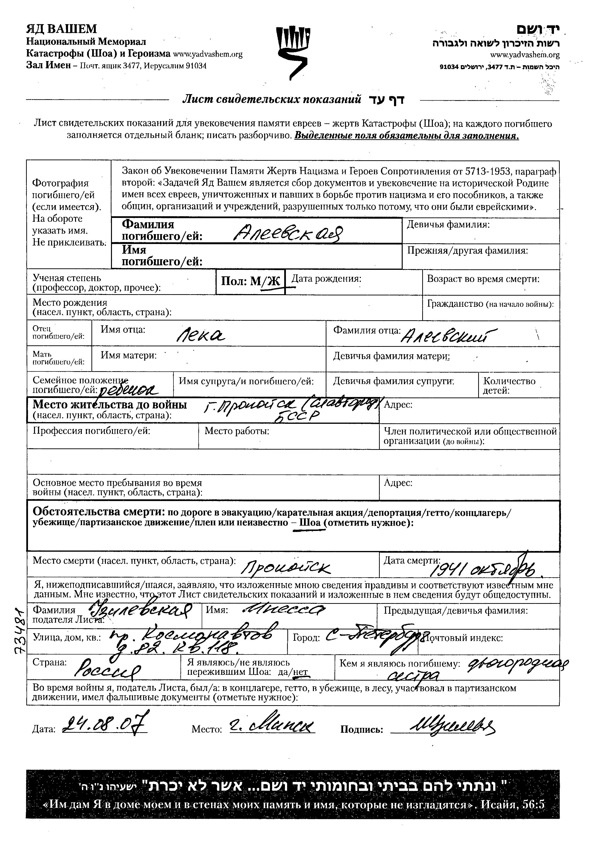 שם פרטי לא ידוע Aleyevskaya נולדה לLeka. היא היתה ילדה. לפני מלחמת העולם השניה התגוררה בPropoysk שבביאלורוסיה (ברה"מ). בזמן המלחמה היא היתה בPropoysk שבביאלורוסיה (ברה"מ). היא נרצחה בשואה. מקום המוות: Propoysk שבביאלורוסיה (ברה"מ) בשנת 10/1941.