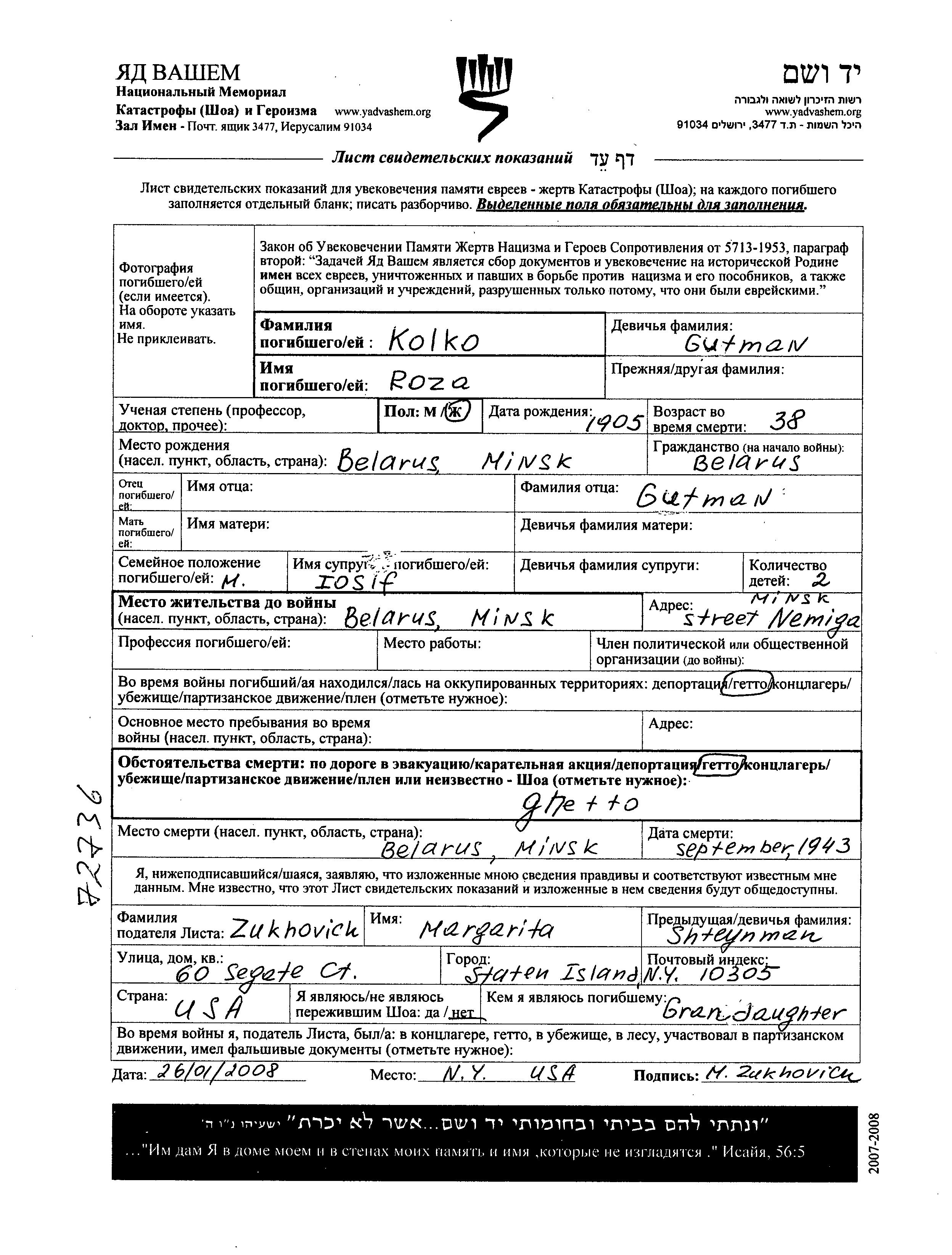 רוזה נרצחה בשואה. מקום המוות: Minsk שבביאלורוסיה (ברה"מ) בשנת 09/1943.