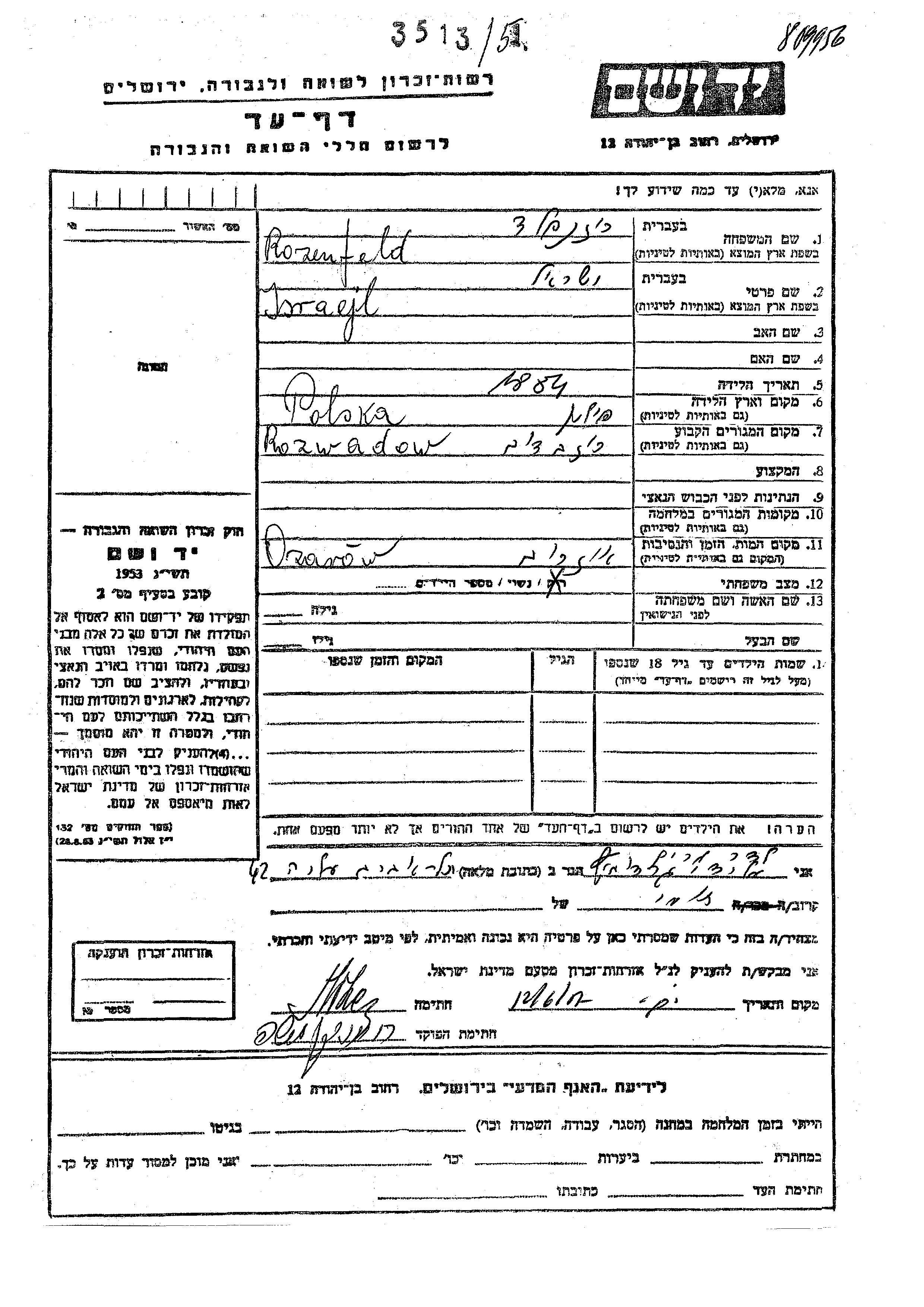 Israejl רוזנפלד נולד בפולין שבפולין בשנת 1884. הוא היה נשוי. לפני מלחמת העולם השניה התגורר בRozwadów שבפולין. הוא נרצח בשואה. מקום המוות: Ozarow שבפולין.