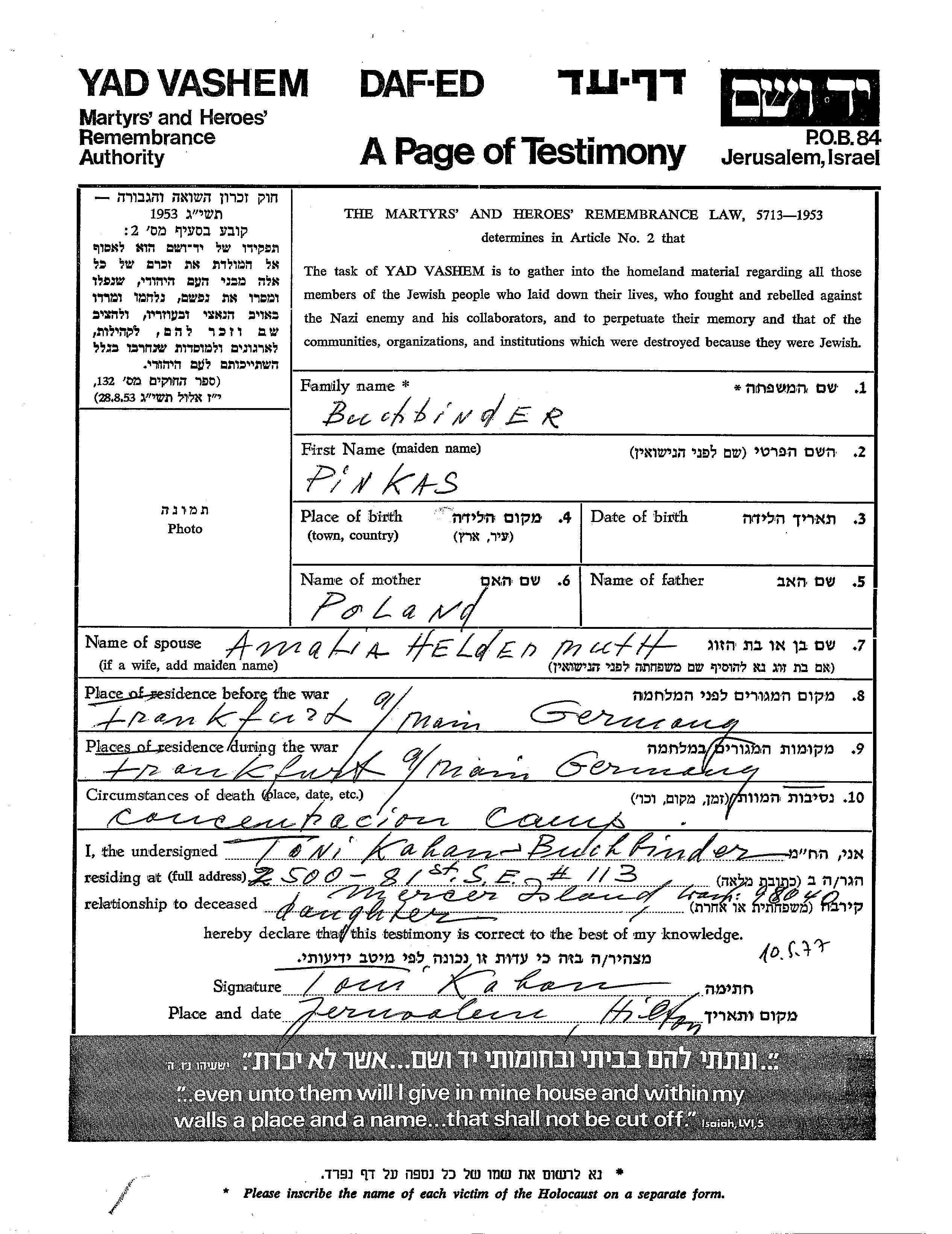 פינקס Buchbinder נולד בפולין. הוא היה נשוי לאמליה לבית Heldenmuth. לפני מלחמת העולם השניה התגורר בFrankfurt שבגרמניה. בזמן המלחמה הוא היה בFrankfurt שבגרמניה.