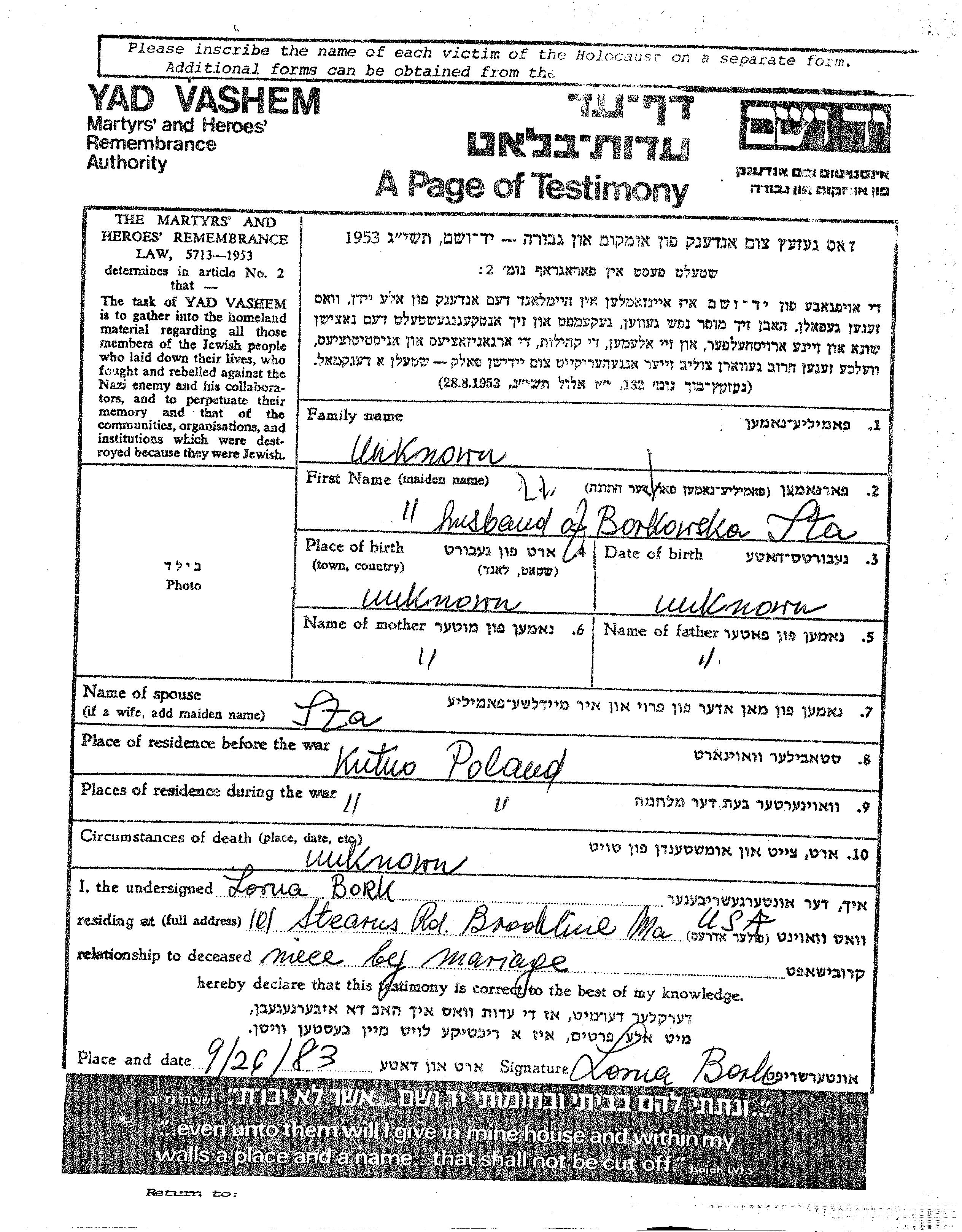 שם פרטי לא ידוע שם משפחה לא ידוע. הוא היה נשוי לאיטה לבית Borkowska. לפני מלחמת העולם השניה התגורר בKutno שבפולין. בזמן המלחמה הוא היה בKutno שבפולין. הוא נרצח בשואה.