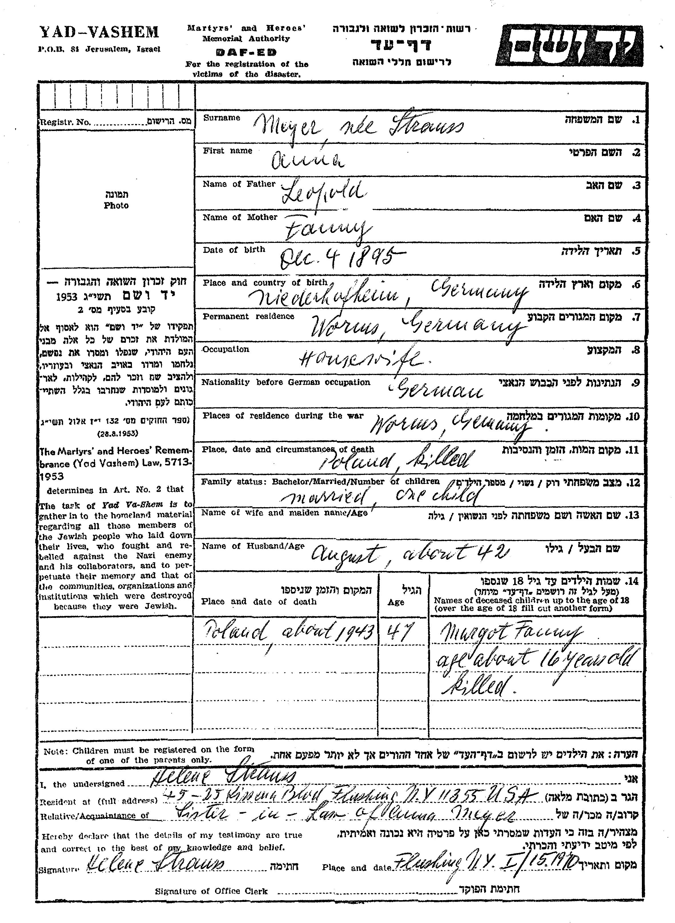 אנה Meyer לבית Straus נולדה בNiederhofheim שבגרמניה בשנת 1895 ללאופולד וFanny. היא היתה עקרת בית ונשואה לאוגוסט. לפני מלחמת העולם השניה התגוררה בWorms שבגרמניה. בזמן המלחמה היא היתה בWorms שבגרמניה. אנה נרצחה בשואה. מקום המוות: פולין שבפולין.