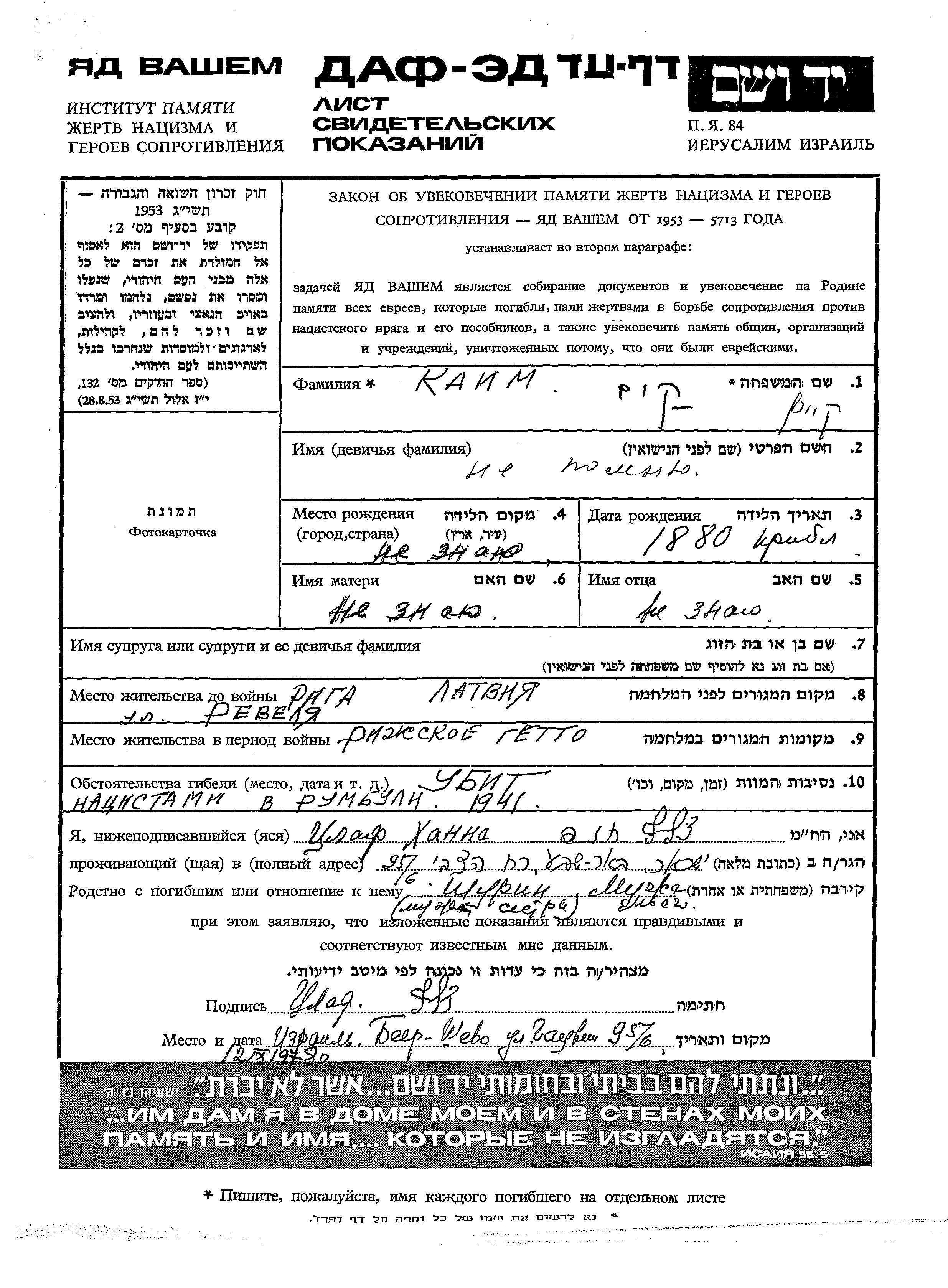 שם פרטי לא ידוע Kaim קים נולד/ה בשנת 1880. לפני מלחמת העולם השניה התגורר/התגוררה בRiga שבלטביה. בזמן המלחמה הוא/היא היה/היתה בRiga שבלטביה.