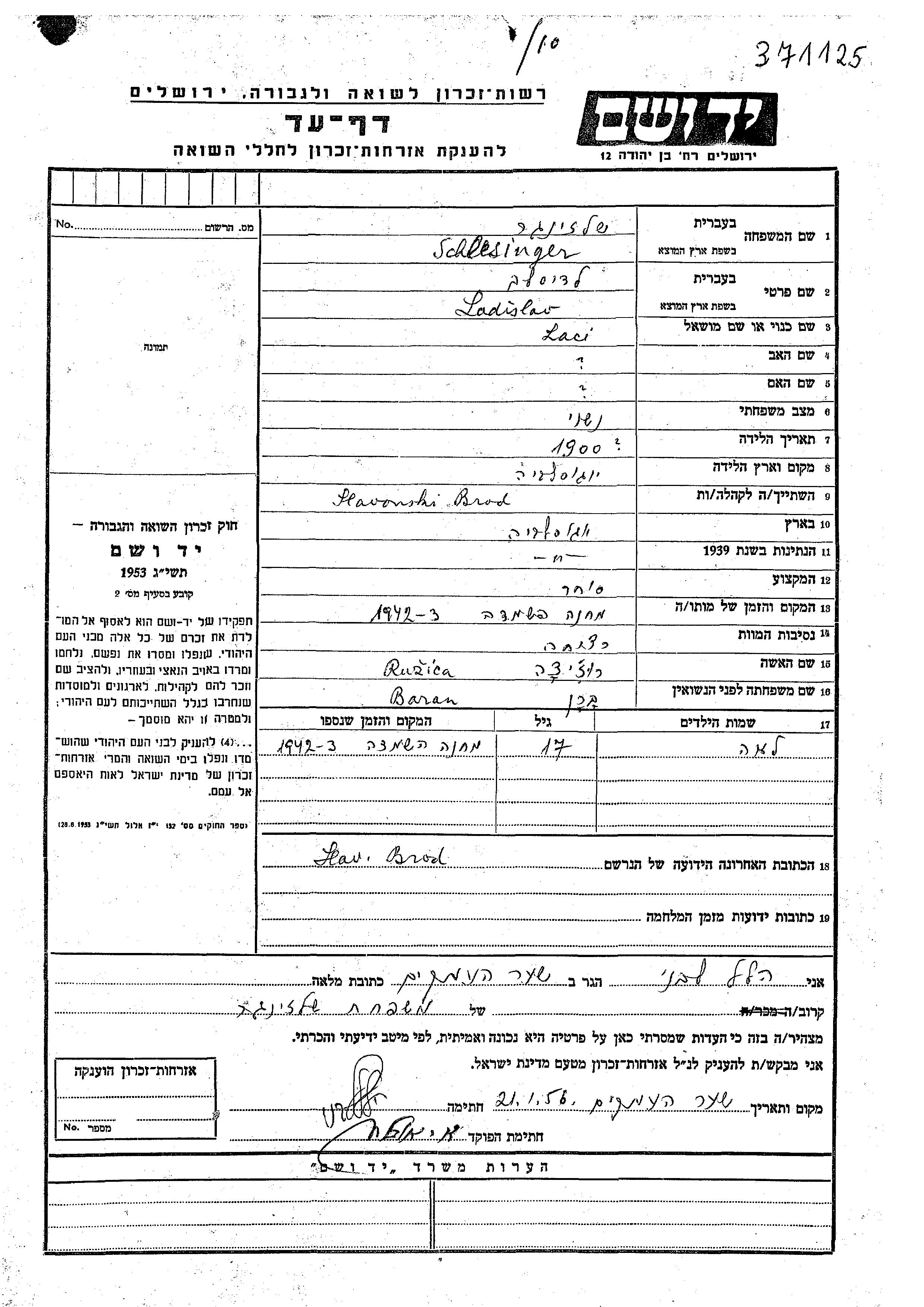 Laci Schlesinger נולד ביוגוסלביה בשנת 1900. הוא היה סוחר ונשוי לRuzica לבית ברן. לפני מלחמת העולם השניה התגורר בSlavonski Brod שביוגוסלביה. בזמן המלחמה הוא היה בSlavonski Brod שביוגוסלביה.