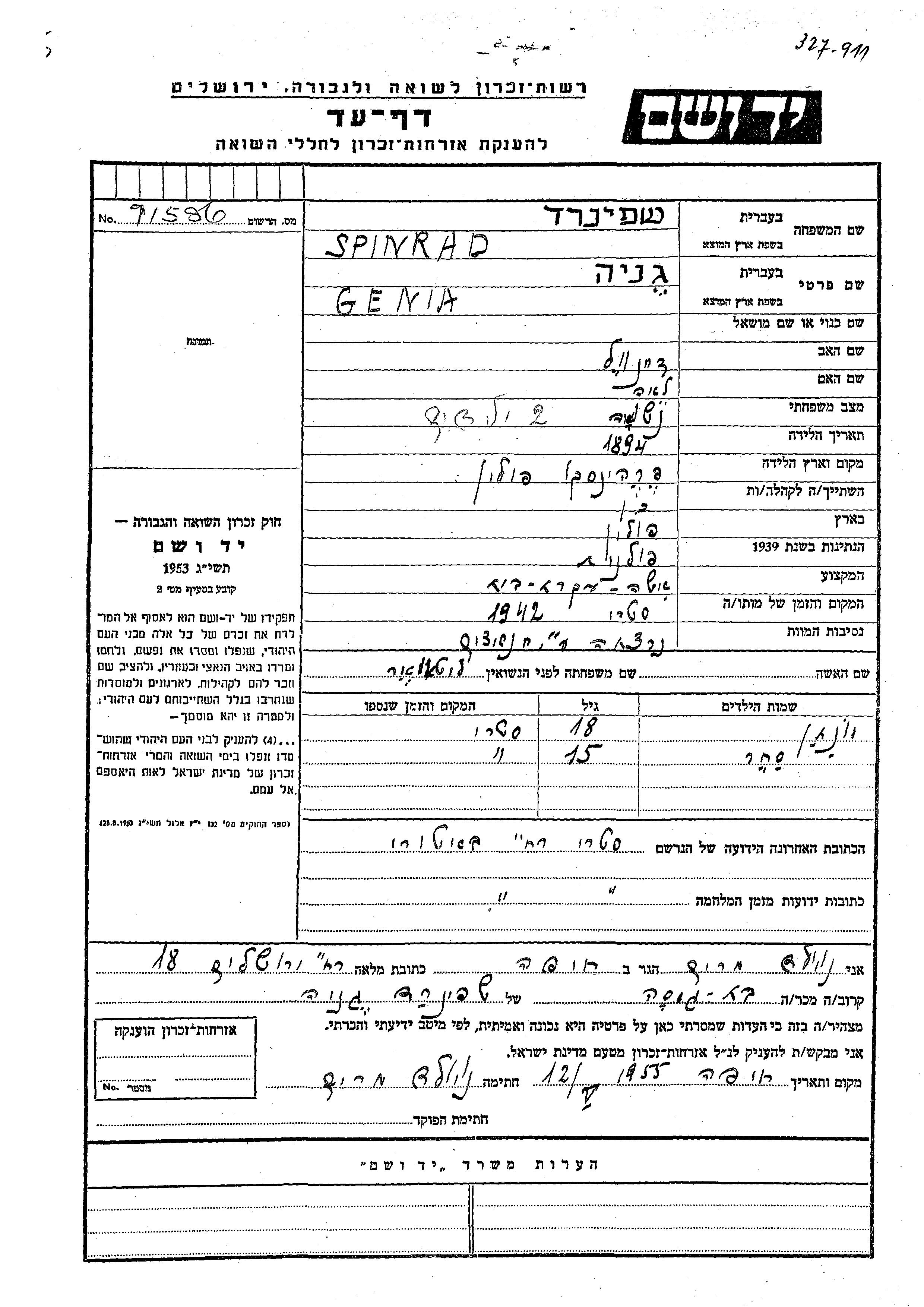 Genia Spinrad לבית ליטאואר נולדה בPerehinsko שבפולין בשנת 1894 לזיינוול ולאה. היא היתה עקרת בית ונשואה. לפני מלחמת העולם השניה התגוררה בStry שבפולין. בזמן המלחמה היא היתה בStry שבפולין. היא נרצחה בשואה. מקום המוות: Stry שבפולין בשנת 1942.