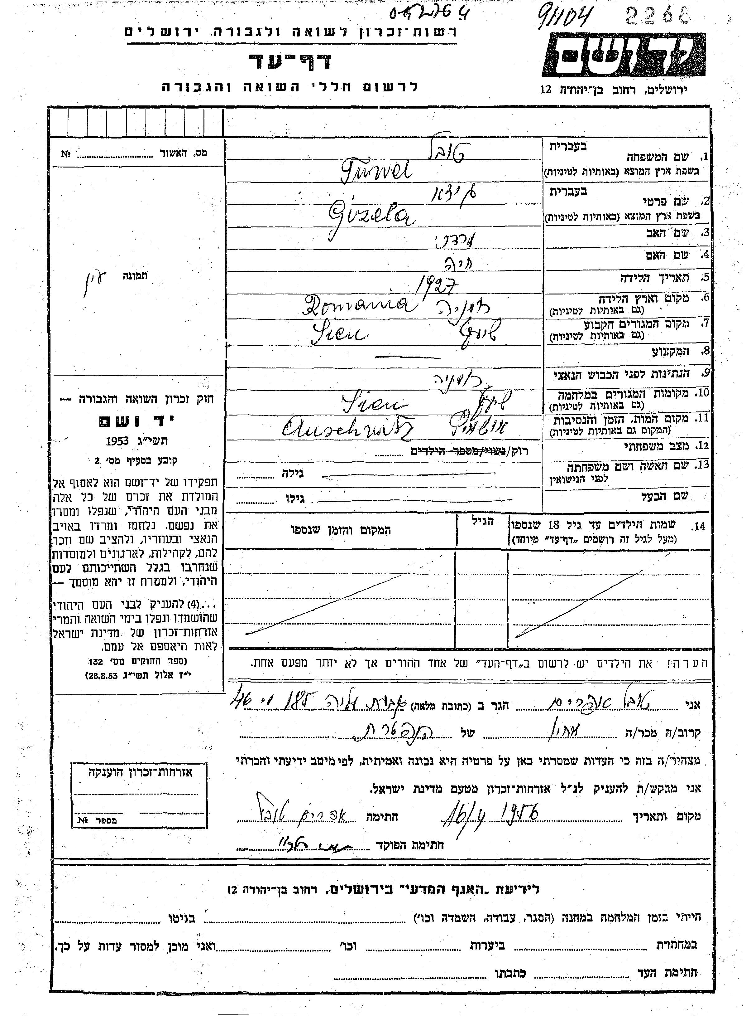 גיזא גיזלה נרצחה בשואה. מקום המוות: Auschwitz שבפולין.