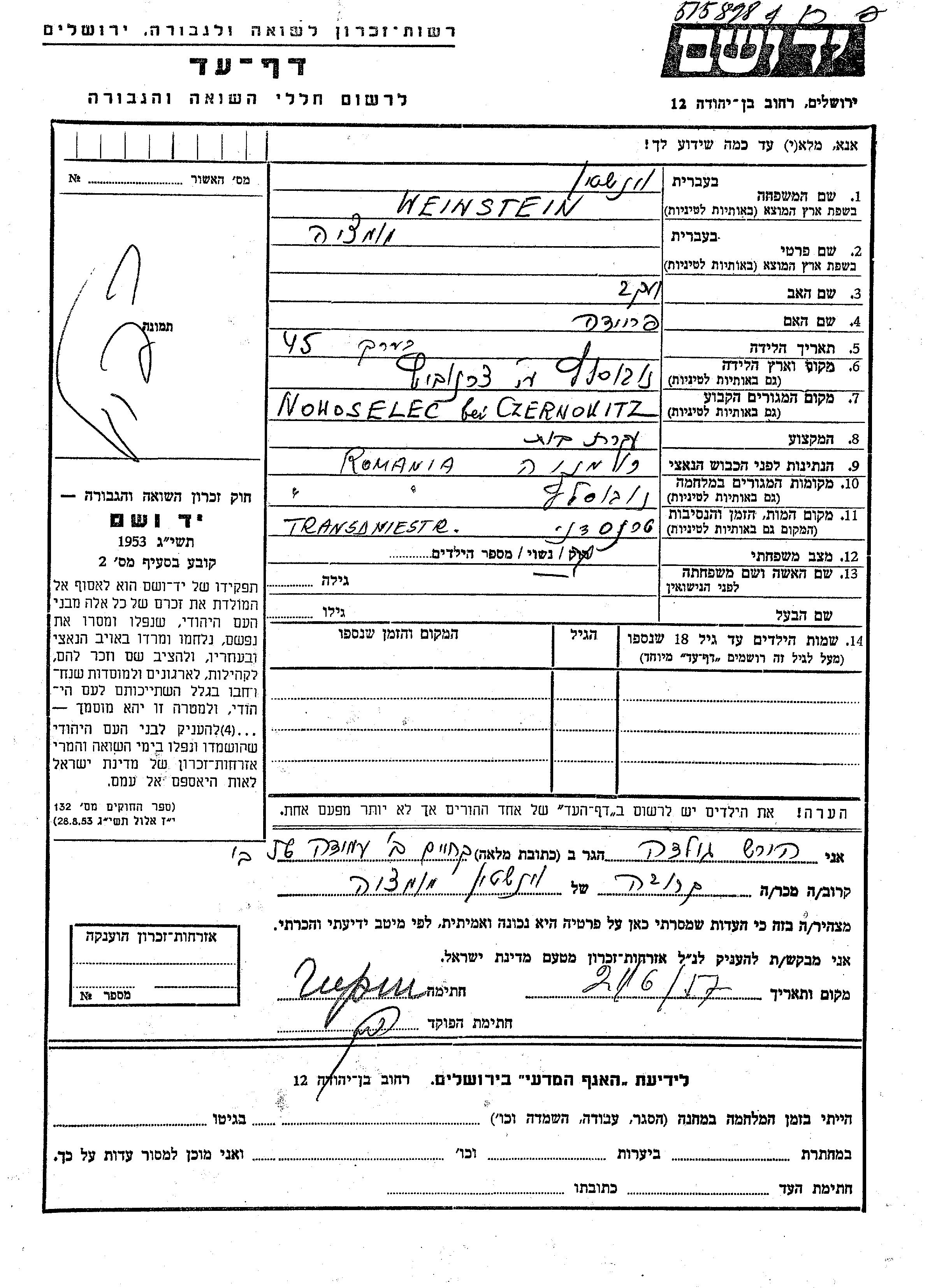 מומציה Weinstein נולדה בNowosielc שברומניה ליעקב ופריידה. היא היתה עקרת בית ונשואה. לפני מלחמת העולם השניה התגוררה בNowosielc שברומניה. בזמן המלחמה היא היתה בNowosielc שברומניה. מומציה נרצחה בשואה. מקום המוות: Transnistria שבאוקראינה (ברה"מ).