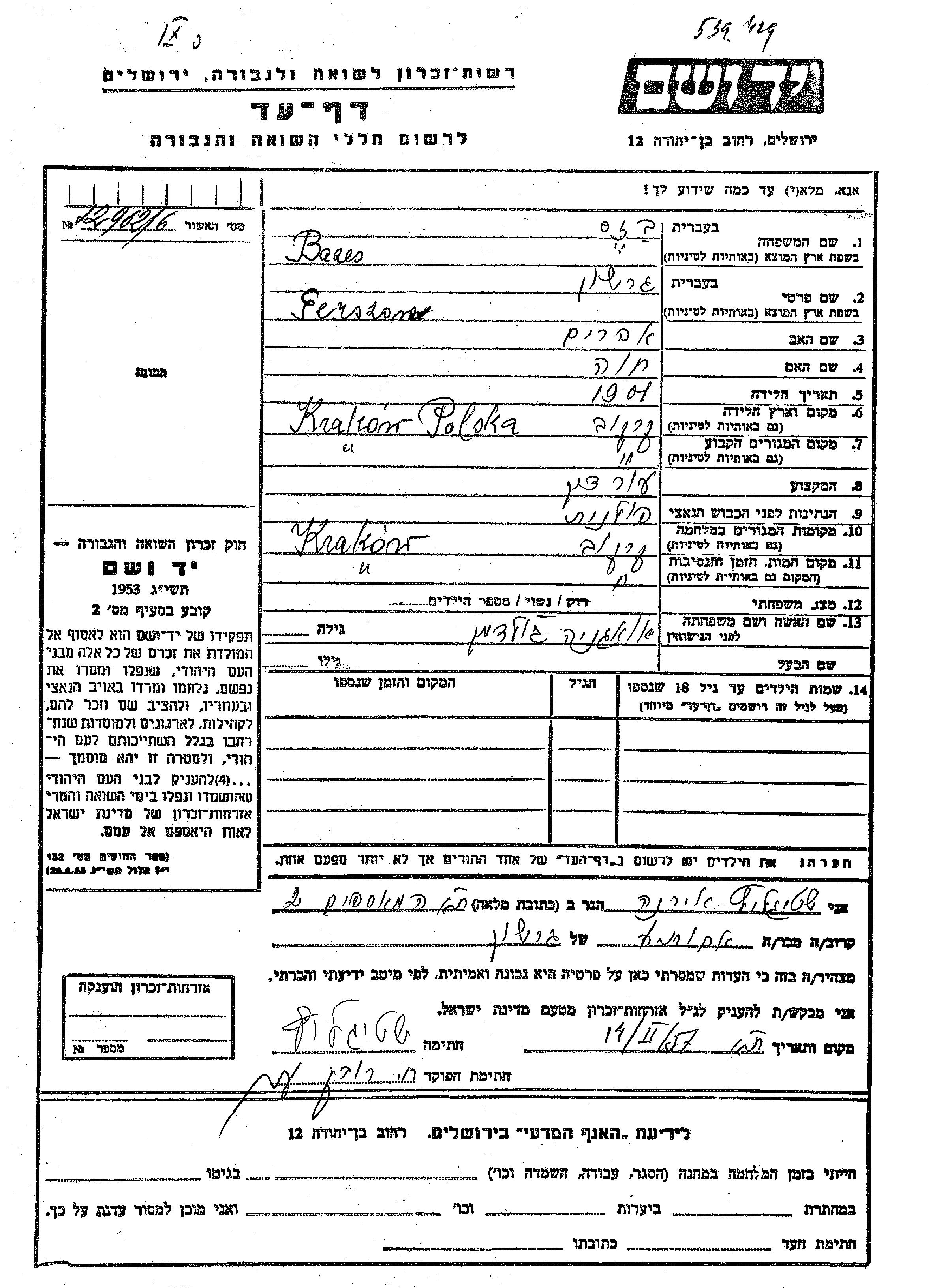 הוא נרצח בשואה. מקום המוות: Krakow שבפולין.