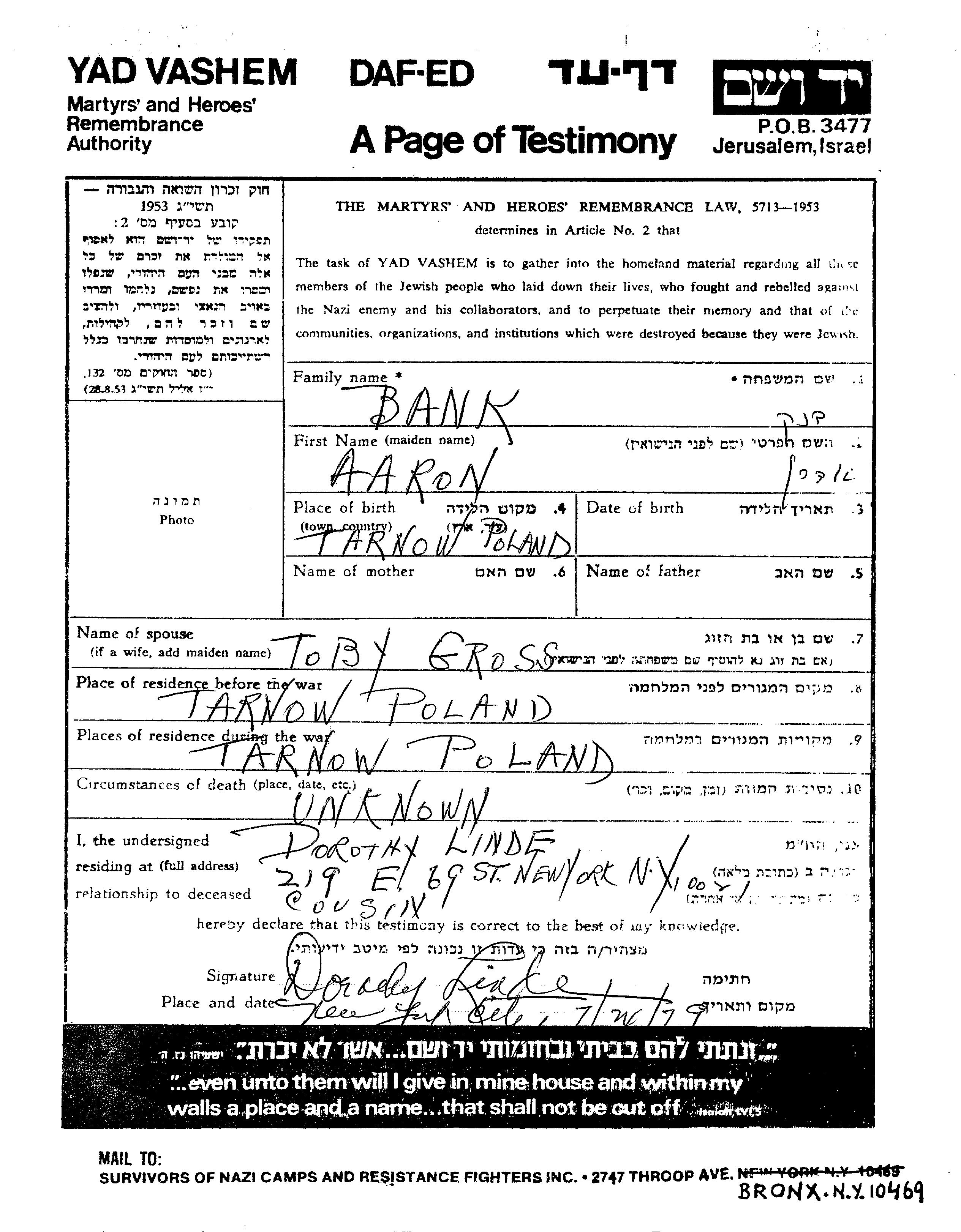 Aaron בנק נולד בTarnow שבפולין. הוא היה נשוי לToby לבית Gross. לפני מלחמת העולם השניה התגורר בTarnow שבפולין. בזמן המלחמה הוא היה בTarnow שבפולין. הוא נרצח בשואה.